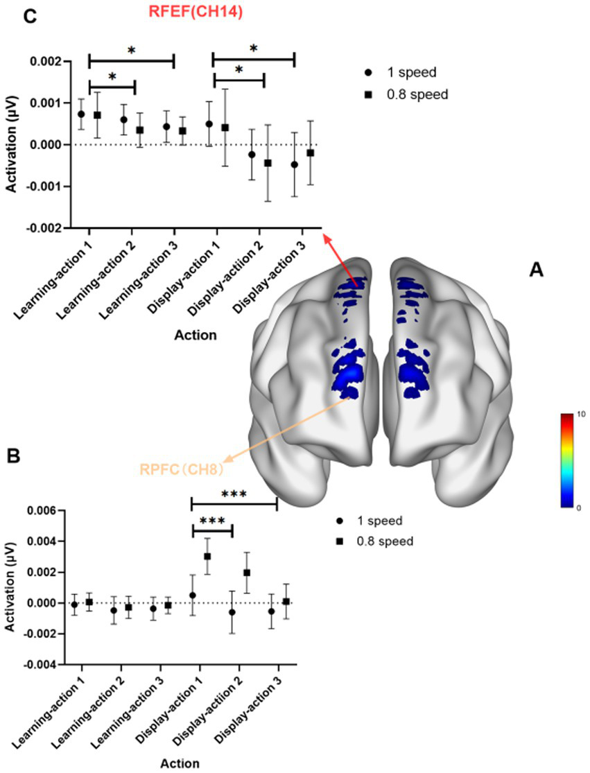The results indicate that the activation in the FPC and FEF for Action 1 is significantly greater than that for Action 2 and Action 3, and the activation in the RFEF for Action 1 is greater than that for Action 3 (see Figure 4). For the RFPC, Channel 1 (F = 8.00, p < 0.001, Eta2 = 0.12), Channel 8 (F = 8.69, p < 0.001, Eta2 = 0.13), and RFEF Channel 14 (F = 7.20, p = 0.0011, Eta2 = 0.11) show significantly greater activation for Action 1 compared to Action 2 and Action 3. For the RFEF, Channel 18 (F = 7.45, p < 0.001, Eta2 = 0.11) shows greater activation for Action 1 than for Action 3.