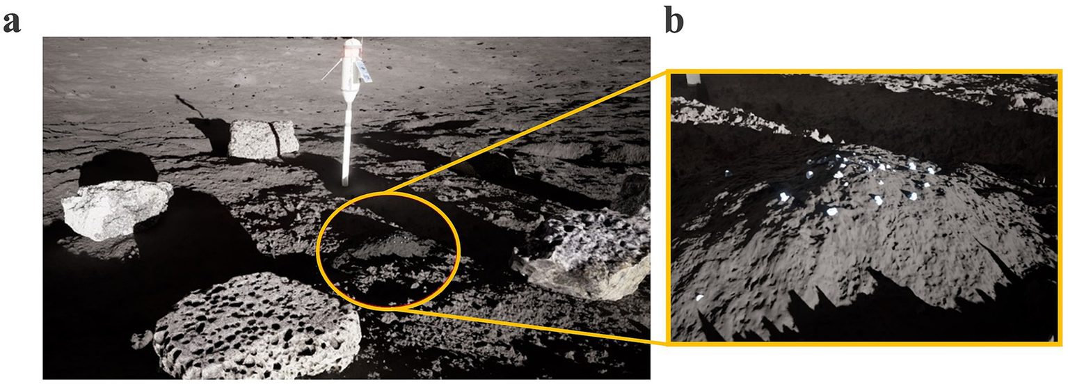 In addition to the above tasks, participants were instructed at pre-briefing to “keep your eyes open for any unusual rocks or features beyond the ones targeted for geology sampling.” Unknown to participants, an “unexpected discovery” represented as water ice crystals buried in a small mound of lunar regolith (Figure 5) were placed within the bounds of two out of the four geology sites for each test condition.