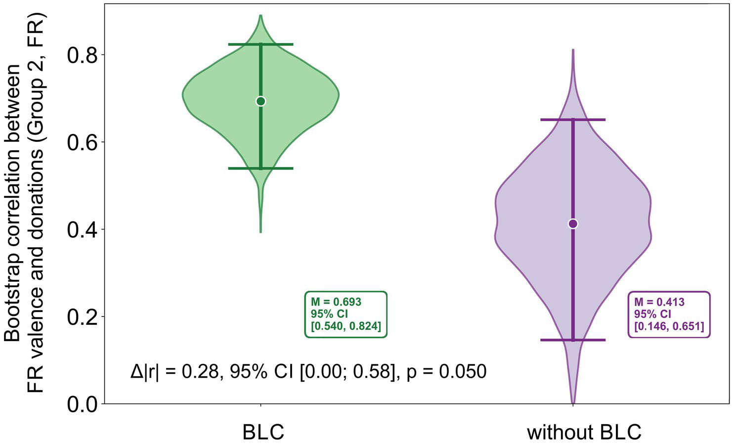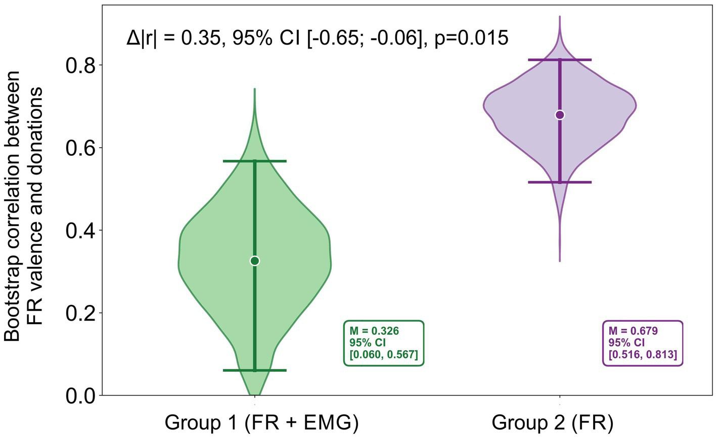 Bootstrap distributions of correlations between FR valence and donations in Group 1 (FR + EMG) and Group 2 (FR). In each iteration, subjects were resampled within each image, image-level means were computed, and correlations were calculated across images separately for each group. The annotated Δ|r| denotes the difference between bootstrap-based point estimates, whereas the Δ|r| reported in the text is computed from correlations averaged across stimuli in the original (non-bootstrap) data.