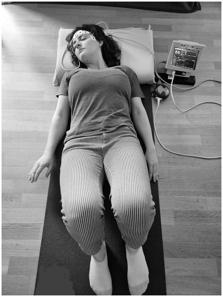 The measurement was conducted in a quiet room to avoid any disturbance. For the test of suggestibility, participants were positioned on a comfortable chair with device-specific adhesive bilateral electrodes fixed on the forehead, following the manufacturer’s instructions. For the subsequent mind–body intervention, the test subject first sat on the floor on a comfortable mat with a pillow after the introduction the participant lay down on the mat to follow the instruction of the audio file. The test setting is shown in Figure 1.