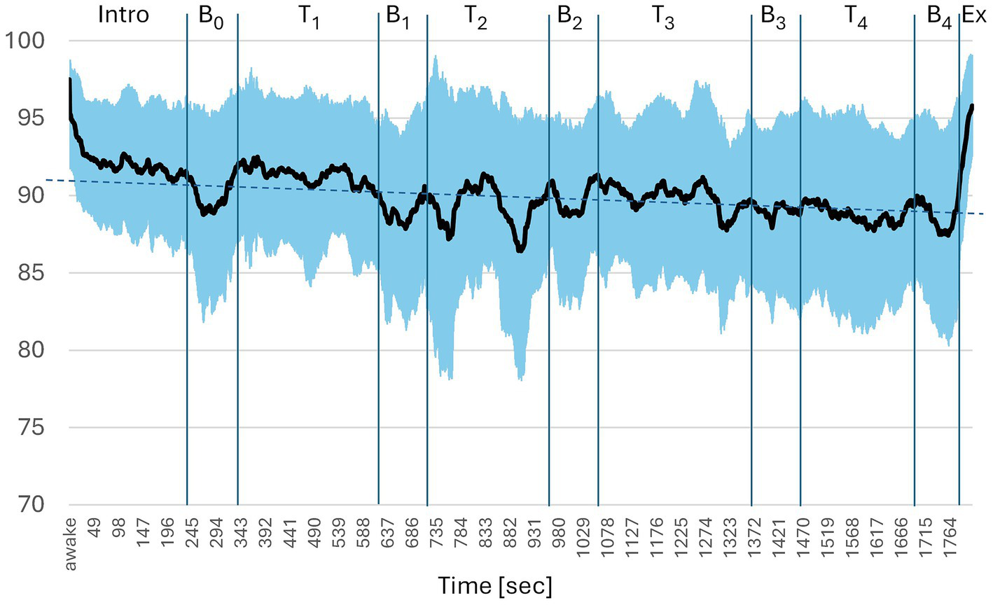Bispectral index during mind–body intervention. Intro = introduction, B = breaks 0–4, T = tasks 1–4, Ex = exit; n = 54. Dotted blue line: linear regression of 1 min-intervals y = 91.43–0.11*x, R2 = 0.545, p < 0.001.