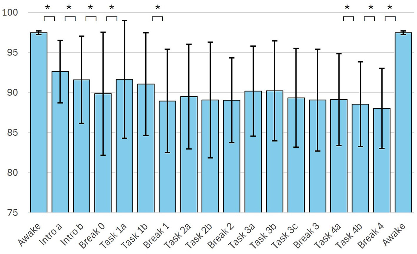 | Suggestibility Test (31.5 min, n = 52) | 97.41 ± 0.26 | 89.62 ± 6.04 | 86.68 ± 6.55* |