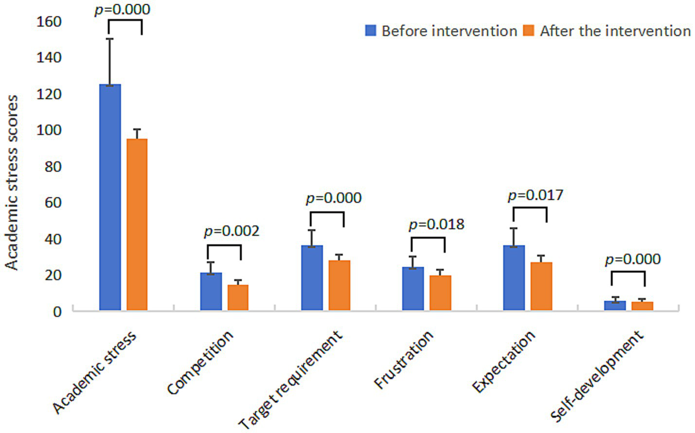 | Academic stress | 29.73 ± 1.38 | 25.09 ± 37.07 | −4.31 | 0.000*** | |