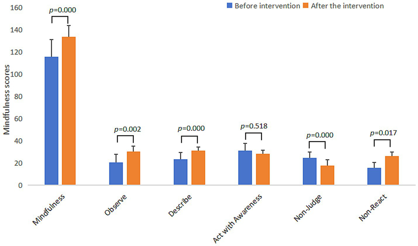 Through the test of the difference between the experimental group and the control group (Table 4), it was found that there were significant differences between the experimental group and the control group in sleep quality, academic stress, and mindfulness, with statistically significant changes. Except for use of sleep medication (t = 1.52, p = 0.14) and act with awareness (t = 0.65, p = 0.52), the differences on other subscales were also significant. The changes in sleep quality, academic stress and mindfulness scores of the experimental group before and after the intervention are shown in Figures 2–4 respectively.