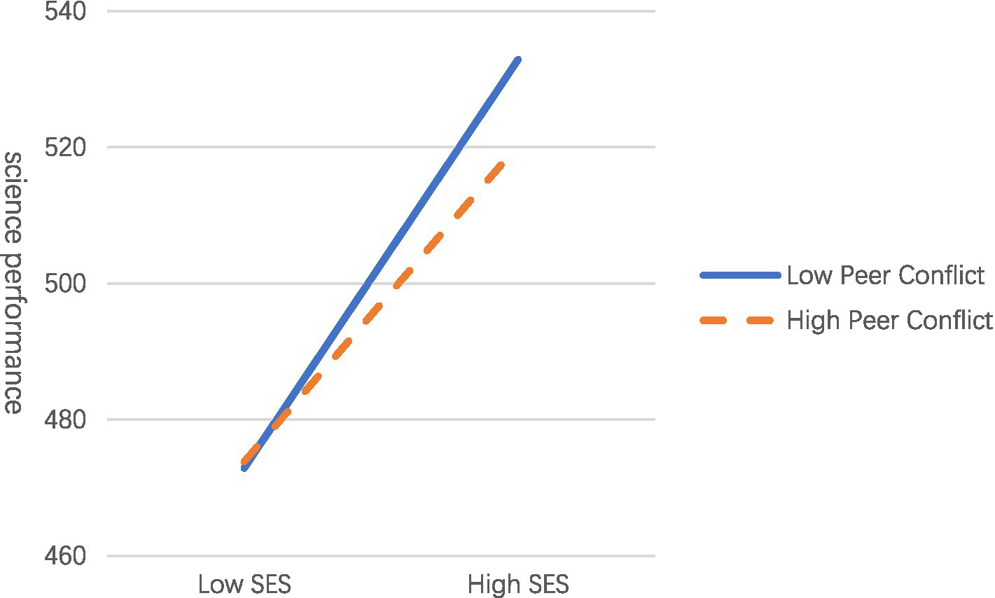 In contrast, negative peer interactions may undermine students’ engagement and disrupt collaborative learning processes, thereby constraining the effective use of learning resources (Ladd and Kochenderfer-Ladd, 2009; Wentzel et al., 2018). Consequently, higher levels of peer conflict may weaken the positive association between SES and science performance.