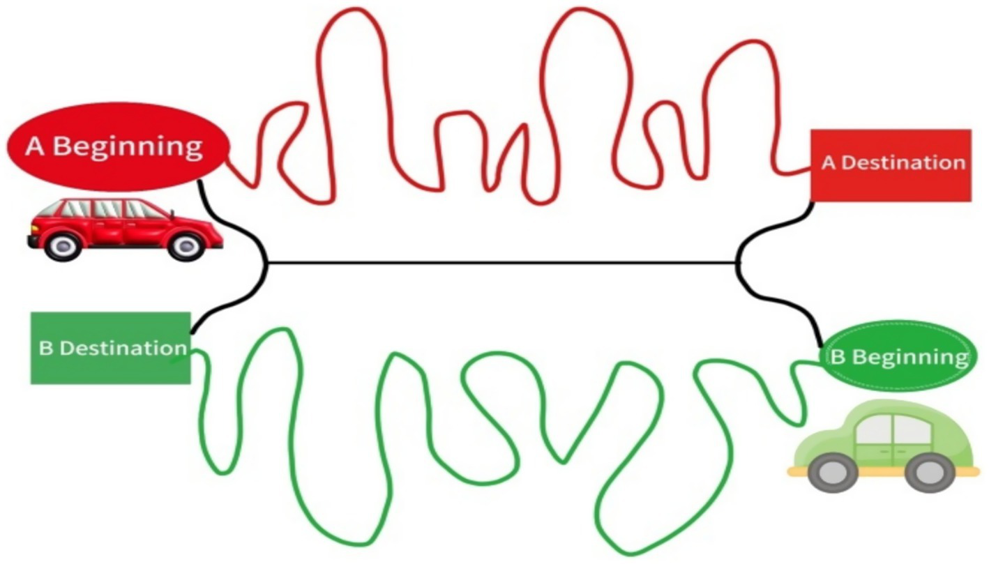 The measurement tool is used as follows: Children participate in pairs, each driving Truck A or Truck B, following a route map (as shown in Figure 1). Each truck is required to depart from the starting point and reach the destination as quickly as possible (time is not actually measured; only the children’s path selection is observed). Each truck has its own dedicated route, but this route is long and time-consuming. A one-way road is set up in the middle, which both parties can use but only one truck at a time. This one-way road is short, and the waiting time increased by alternating use of the one-way road is more economical and efficient than using the backup route. Communication between the two parties is allowed during the experiment. Finally, the level of cooperative behavior is scored based on the routes chosen by the two children.