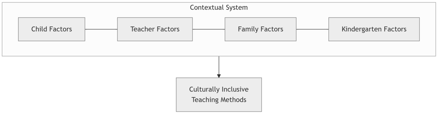 This study found that culturally inclusive teaching methods do not operate in isolation but are jointly shaped by multi-level systemic factors, including young children, teachers, families, and kindergartens (see Figure 3). These factors are interwoven and influence teachers' instructional decisions and practice pathways through mechanisms such as contextual constraints, value orientations, and resource support.