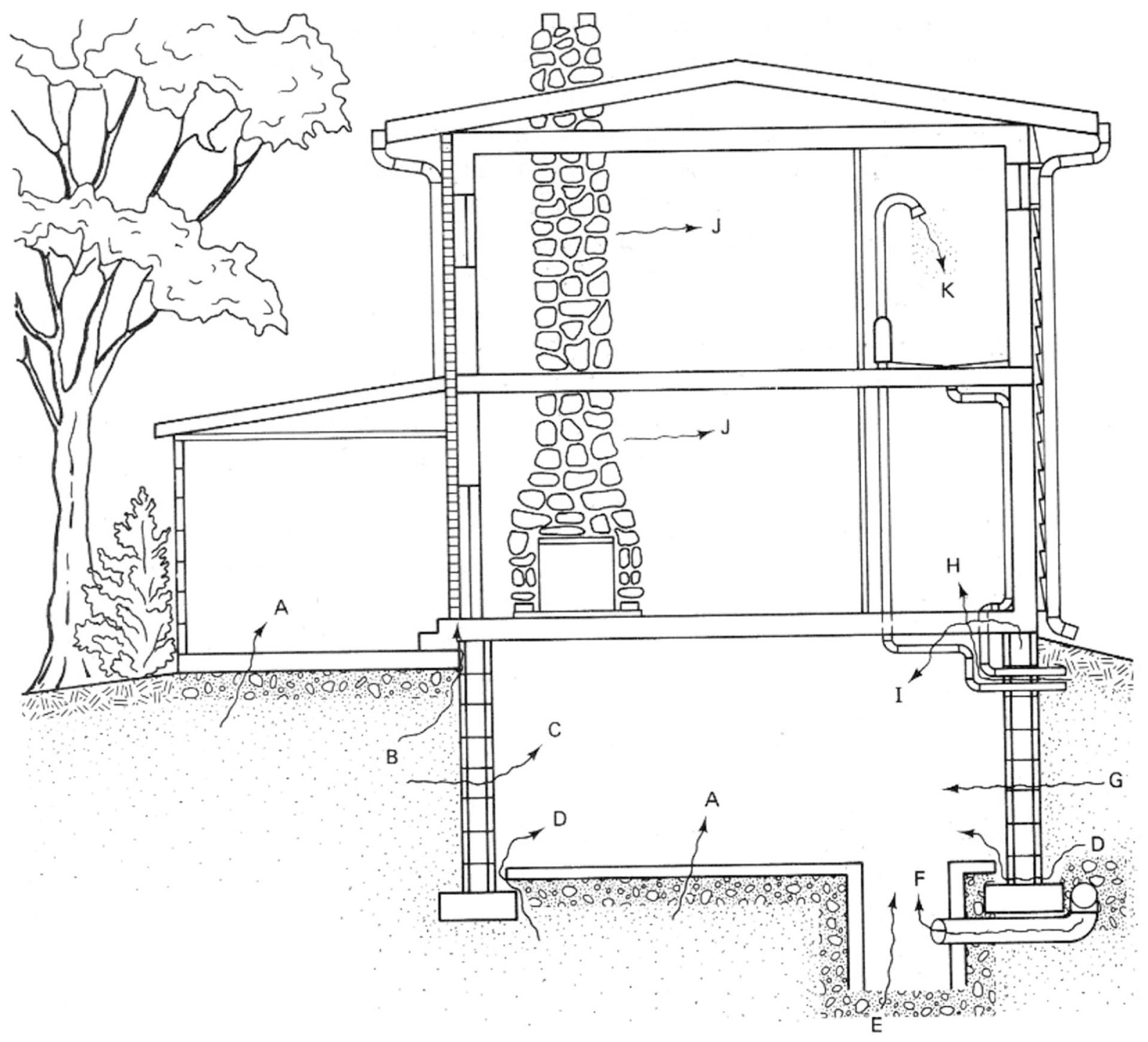Radon’s major entry points into a home. A, cracks in concrete slabs; B, spaces behind brick veneer walls that rest on hollow – block foundation; C, pores and cracks in concrete blocks; D, floor–wall joints; E, exposed soil, as in a sump; F, weeping (drain) tile, if drained to popen sump; G, mortar joints; J, building materials, such as some rock; K, water (from some wells). Reproduced from Ref. (12).