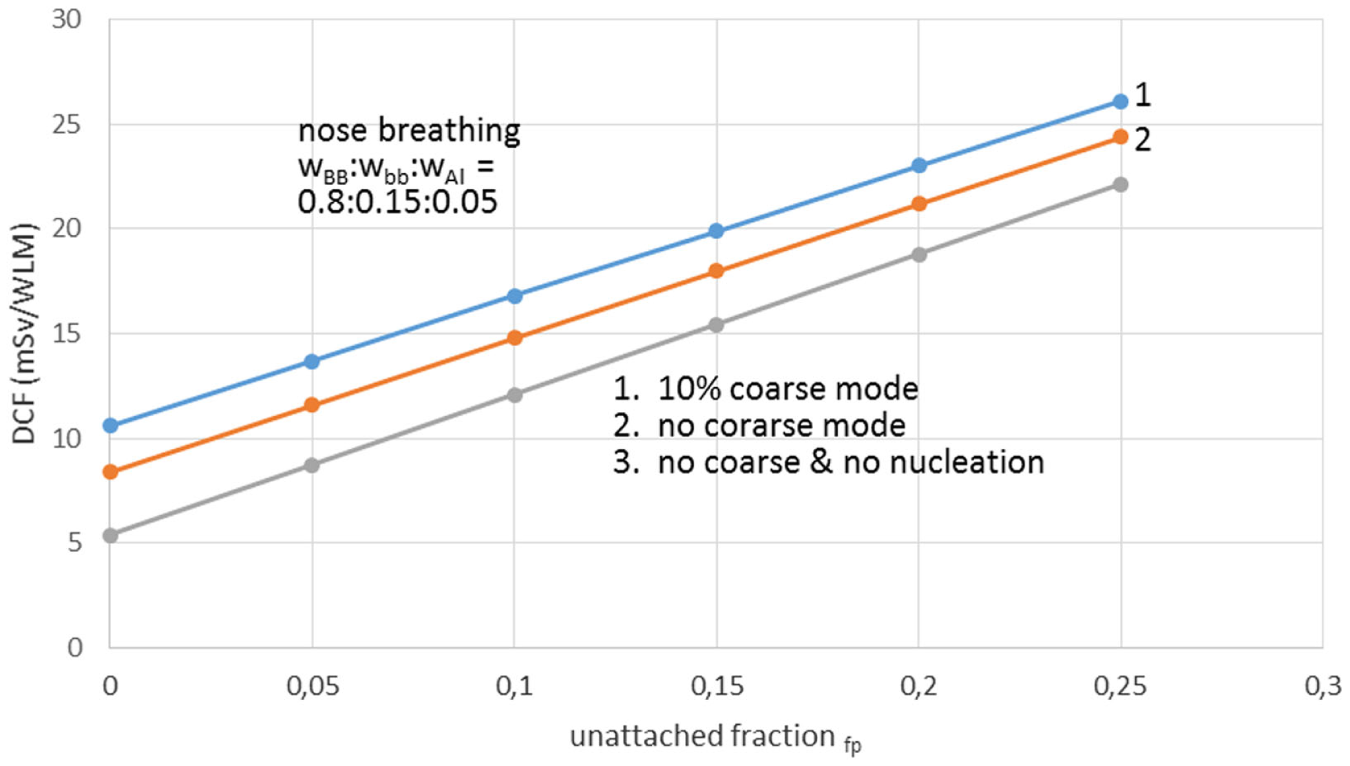 Following the results from several epidemiological investigations, various DCFs have been proposed so-far. United Nations Scientific Committee on the Effects of Atomic Radiation (35) proposed the DCF of 0.17 nSv/Bq h m−3 regarding the exposure to 222Rn and the DCF of 9 nSv/Bq h m−3 regarding the exposure to EEDC222. ICRP 65 proposed the DCF of 4 mSv/WLM for exposure indoors and the DCF of 5 mSv/WLM for occupational exposure. Both DCFs do not account for the energy fraction carried by free progeny (1).