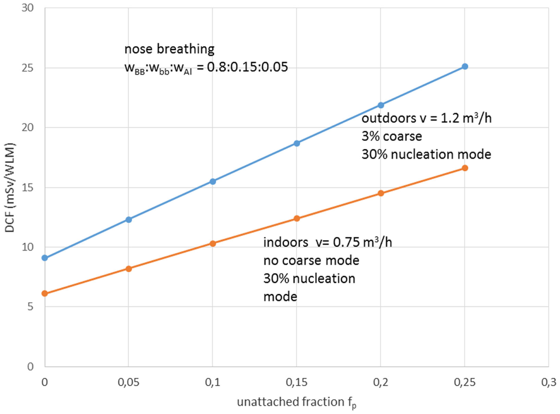 Recent studies proposed various scenarios of dose-affecting environmental factors. Two very significant studies were carried out by Porstendörfer (28, 29). These indicated linear correlation between DCFs and fp factor. A new factor introduced with the term “environmental factor,” which stands for the aerosol particle distribution in ambient air that strongly (directly) affects fp value. Another term introduced was the “individual factor,” which accounts for the size of the lungs (i.e., age), the rate and mode of breathing (nasal or oral, or quota between these two forms). It is emphasized that previous models utilized higher values for DCFs because workers breathe rather orally than from nose. In Porstendörfer (28, 29), the dose per exposure unit of short-lived radon progeny, was calculated using dosimetric approach. Calculations were based on a lung dose model with a structure that is related to the respiratory tract model proposed by ICRP in the report No66. The dose relevant parameters, unattached fraction (fp), and size distribution of the unattached and aerosol attached radon decay products for different living and working places were reported. Taking into account these characteristics, the effective dose per exposure unit and the conversion factor (DCF), of the radon decay products was estimated.