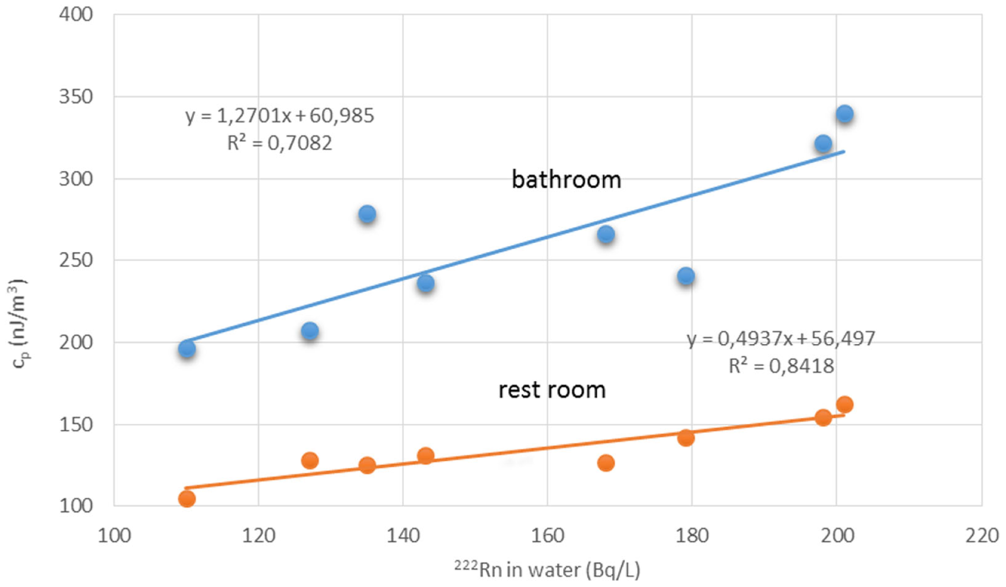 Radon concentration in water samples versus PAEC measured in two different spa premises. Reproduced from data reported in Vogiannis et al. (54).