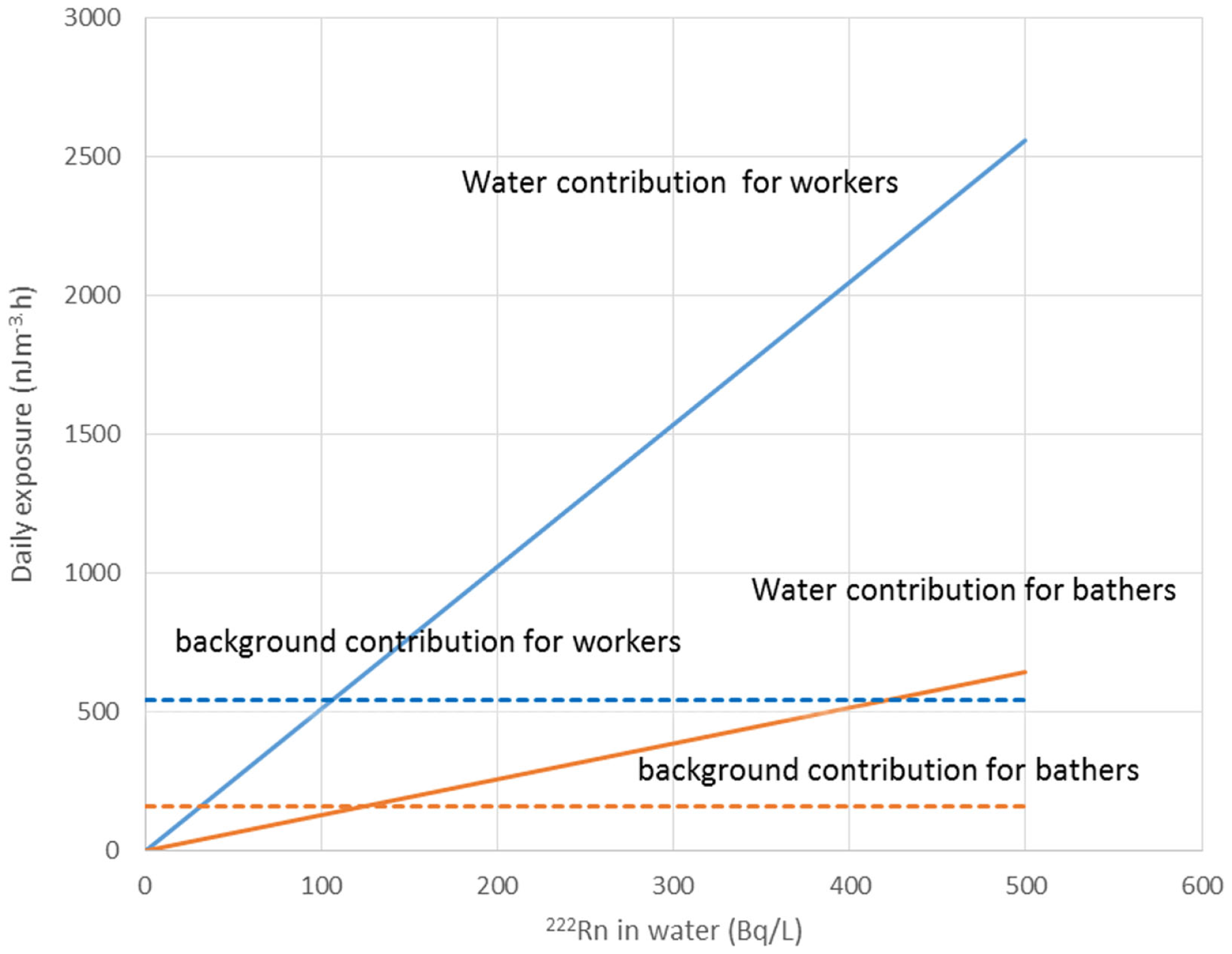 Daily exposure in PAEC correlated with radon in water. Exposure was estimate for works and bathers taking into account the time spent in the various spa premises. Reproduced by data reported in Vogiannis et al. (54).
