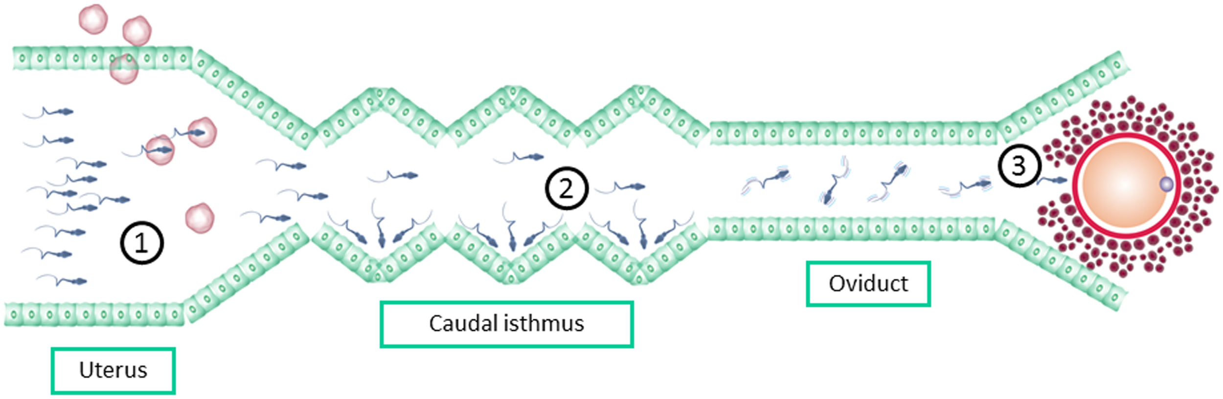Although a large number of spermatozoa are present in the ejaculate, only a minority reach the fertilization place. On the journey of the sperm from the site of deposition to the site of fertilization, spermatozoa should pass through different barriers that ensure that only those with normal morphology and vigorous motility will have chances to fertilize the oocyte forming a healthy embryo (47, 48). Spermatozoa selection under natural circumstances is based on three different steps: (1) the female reproductive tract microenvironment, (2) the sperm–oviduct interactions at the caudal isthmus, and (3) the sperm–zone pellucida interaction (48) (Figure 2). ICSI bypasses this natural selection process of the fertilizing sperm (49), as it does not allow the sperm–oviduct interaction and other spermatozoa selection processes including ZP binding-penetration.