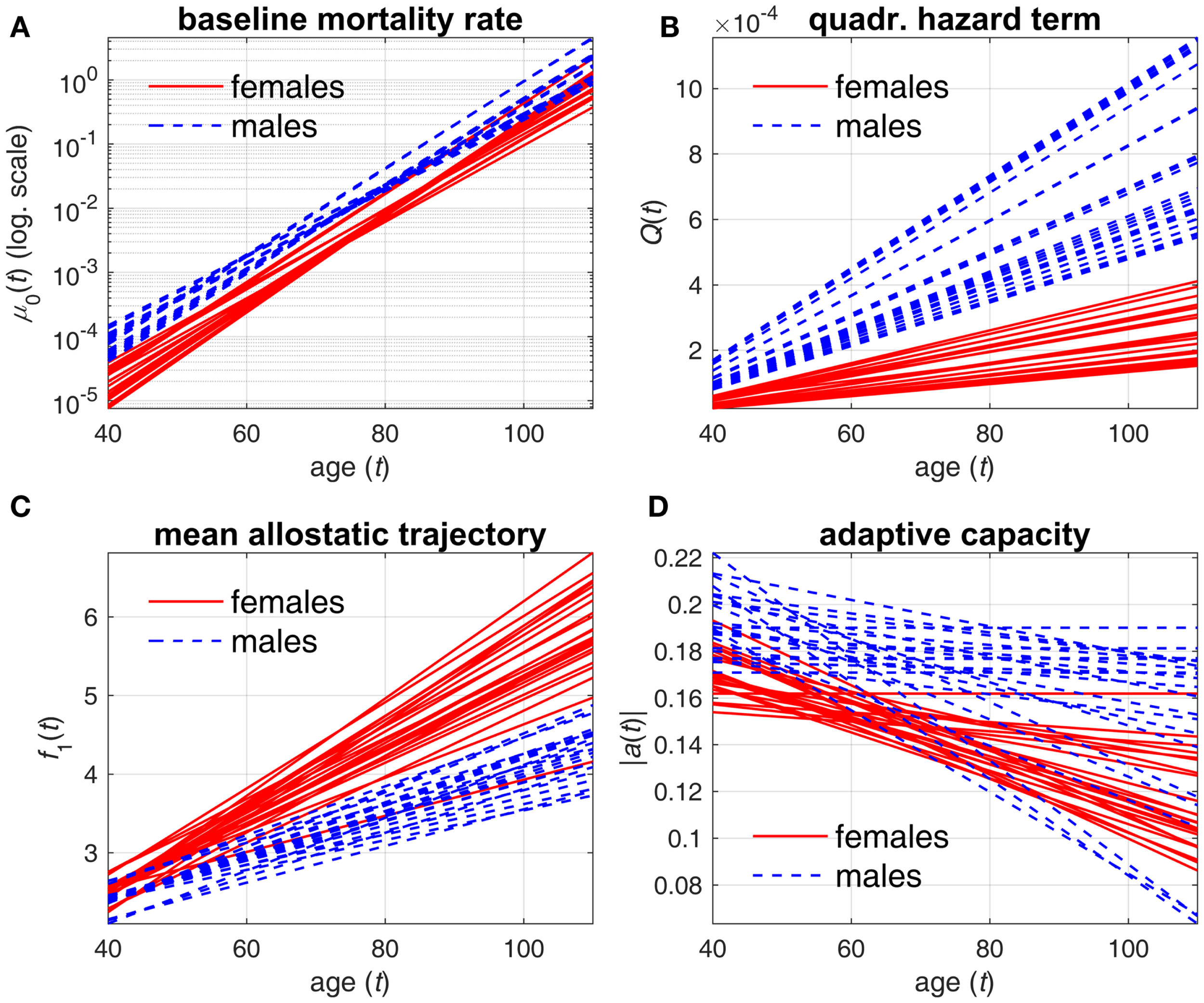 Recently, Cohen et al. (5) presented a novel approach for measuring physiological dysregulation via the joint distribution of multiple biomarkers based on calculation of a multivariate distance called the Mahalanobis distance (which we denote DM) (16, 17). Such a measure represents the deviation of a current physiological state of an organism from the “normal” physiological state. In contrast to previous approaches, such as those used to calculate allostatic load, DM does not depend on a choice of biomarkers known to be associated with poor health, and thus avoids a potential for circularity (18). The interpretation of DM as physiological dysregulation has been validated by showing that it (a) increases with age within individuals, (b) predicts mortality controlling for age, (c) gains predictive power as more variables are included, and (d) is not particularly sensitive to which markers are included, nor to their individual correlations with age (5). It has even been shown to function in a wild bird species (19). While individual trajectories of DM with age have been examined in relation to health outcomes (20), the modeling approach used lacked the advantages of SPMs listed above, notably the ability to quantify adaptive capacity and optimized versus realized trajectories. Differences between men and women have also not been characterized.