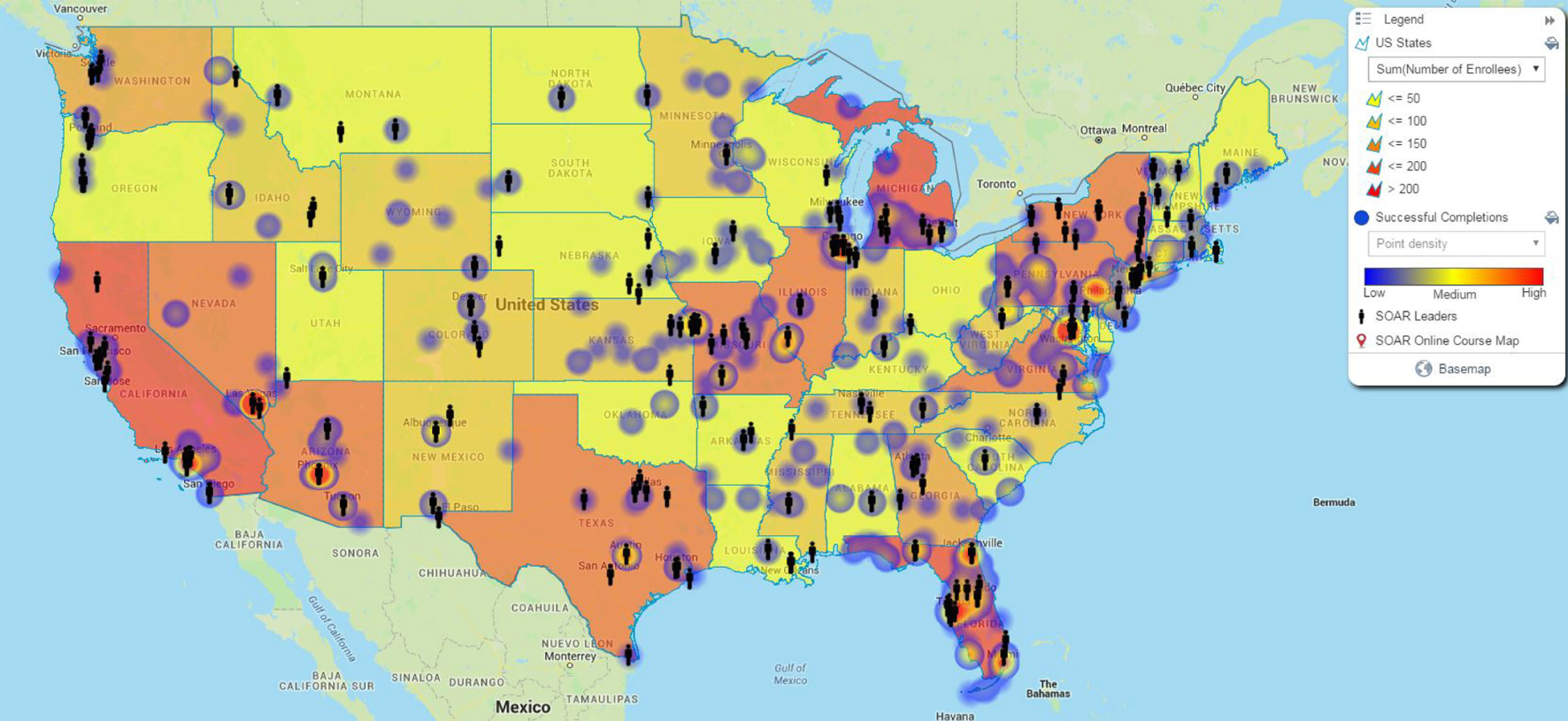 To evaluate course reach and to examine possible correlations between successful course completions and the presence of a local SOAR leader, we created a map with three sets of data: number of enrolled online course users by state, successful course completions by zip code, and the location of a local SOAR leader by city and state. The information about course enrollees and completions was pulled from an internal database for the SOAR Online Course. Location information for SOAR leaders was gathered from an internal database of individuals who attended a 3-day SOAR Leadership Academy, sponsored by SAMHSA, in the 2-year period before the end of the base year. This time frame allowed us to map any potential impact SOAR leaders have on usage of the SOAR Online Course.