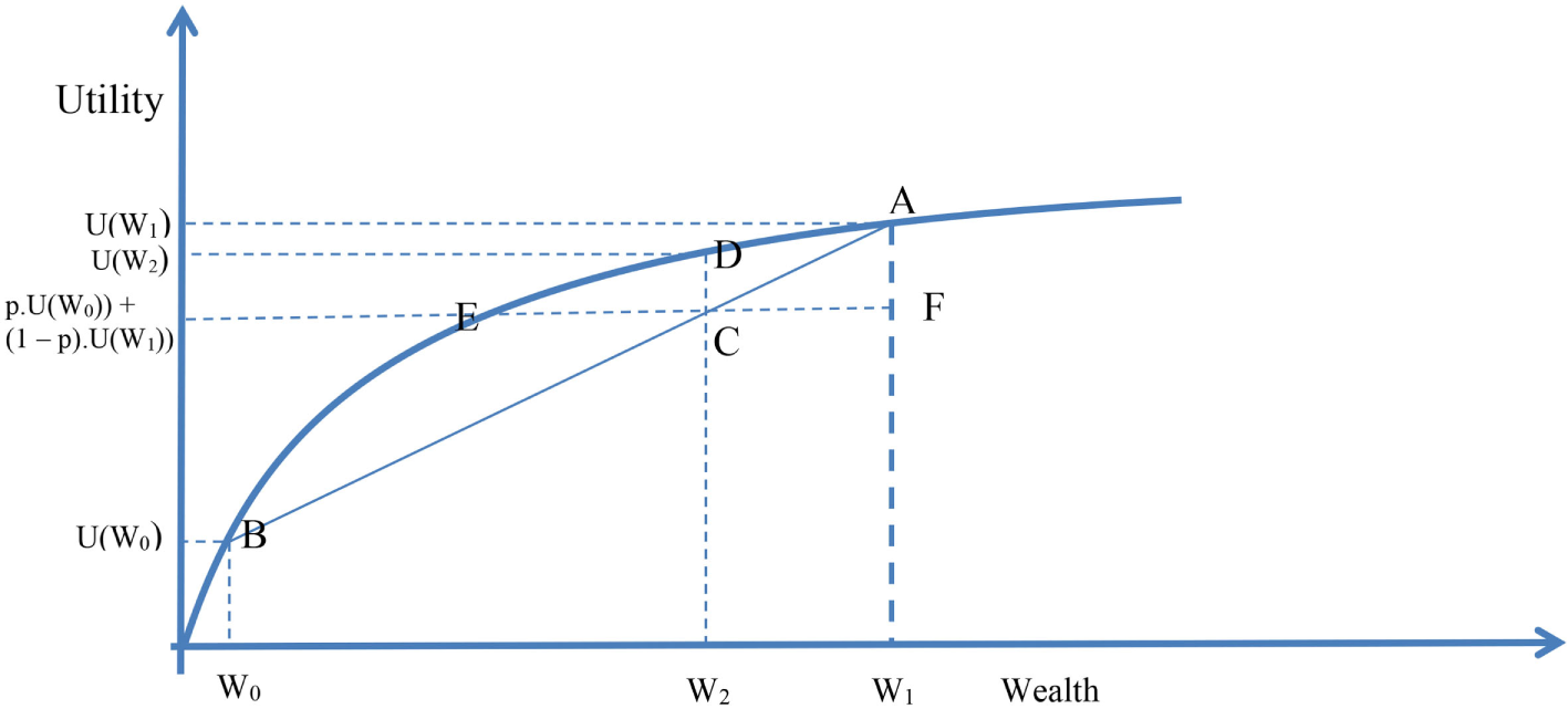 Suppose a person’s wealth is given as W1, the person’s utility of wealth is thus U(W1). We denote the position [W1, U(W1)] in Figure 1 by A. Suppose that most of the person’s wealth is in the form of a home, and that the remaining wealth is given by W0. Its utility is U(W0); and [W0, U(W0)] is given by B in Figure 1. Suppose that the probability of the home being destroyed is p, so the probability of its not being destroyed is (1 − p). Beforehand, not knowing whether the home will be standing or destroyed, the person’s average utility is the average of U(W0) and U(W1) weighted by the probabilities p and (1 − p), and is thus p × U(W0) + (1 − p) × U(W1). We call the corresponding level of wealth W2. We denote the point in Figure 1 as C. This is the utility of the uninsured level of wealth. If the person were to pay W1 − W2 (=CF in Figure 1) as a fair insurance policy beforehand, and the home were subsequently destroyed, the person would have a utility of wealth U(W2), given as D in Figure 1. This is because the insurance policy allows the home to be rebuilt. The distance DC is the increased utility of having the insurance. The distance EC is known as the risk premium. EF is the largest premium that a person would pay for insuring their home, because at E, the person who insures has the same after-the-event utility as the person who is uninsured and whose home is destroyed. Thus, the person is indifferent between insuring and not insuring when they have to pay EF as a premium.