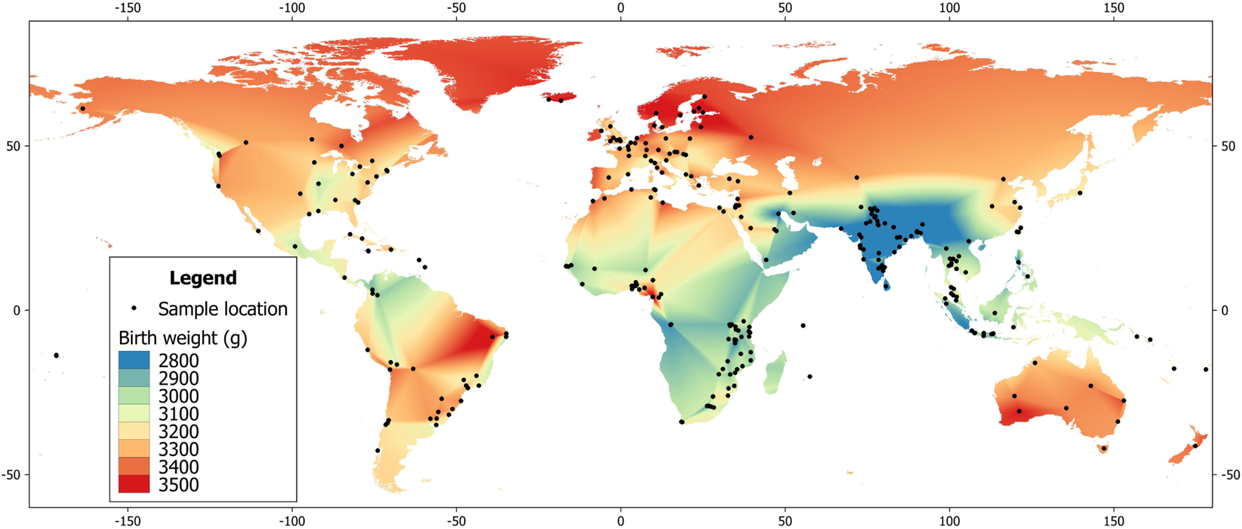 Global heat map of mean birth weight, based on data from the World Health Organization (35).