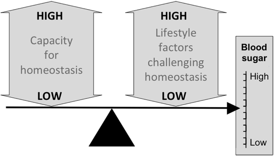 Schematic diagram illustrating the basic capacity–load model of glycemic control, in which blood sugar levels rise in association with traits such as a high glycemic diet, sedentary behavior and, high levels of body fat, and decrease in proportion to the homeostatic capacity of the body, indexed by traits such as pancreatic beta-cell mass and muscle mass.