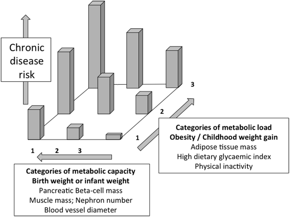 Recognizing these broad dose–response relationships, we have built on the thrifty phenotype hypothesis by proposing a continuous model of disease risk, emphasizing the interaction of two fundamental traits: metabolic capacity, referring to phenotypic traits indexing the capacity for homeostasis, and metabolic load, referring to phenotypic traits that challenge homeostasis (58). For diabetes, the most relevant components of metabolic capacity are the function of the pancreas (responsible for producing insulin) and muscle mass (influencing glucose clearance rate), each of which is strongly contingent on fetal and infant growth (32, 59). The most relevant components of metabolic load are adiposity, dietary glycemic load, and sedentary lifestyle, all of which perturb normal glycemic control and promote chronic inflammation, deleterious to beta-cell function (60, 61).