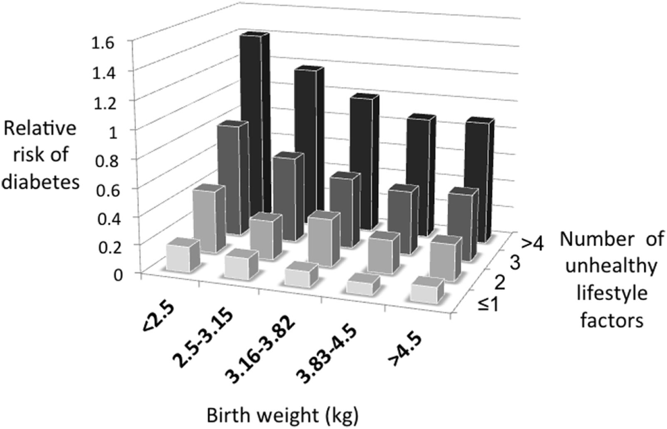 Figure 2 illustrates the basic model, showing how the relationship between capacity and load on an immediate basis impacts the regulation of blood sugar levels. Variability in the relationship between capacity and load over the longer-term then shapes the risk of developing diabetes (Figure 3). Figure 4 provides supporting evidence for this model from three US cohorts. Consistent with the model, birth weight is inversely associated with diabetes risk across its entire range, while “components of an unhealthy adult lifestyle,” including high BMI, are positively associated with diabetes risk. The highest risk of diabetes is, therefore, found in those born small who lead a particularly unhealthy adult lifestyle, promoting the development of abdominal obesity. Importantly, these data support a key prediction of the model, namely that the diabetic risk elicited by low birth weight is relatively low in the absence of metabolic load, but greatly exacerbated in the presence of a high metabolic load.