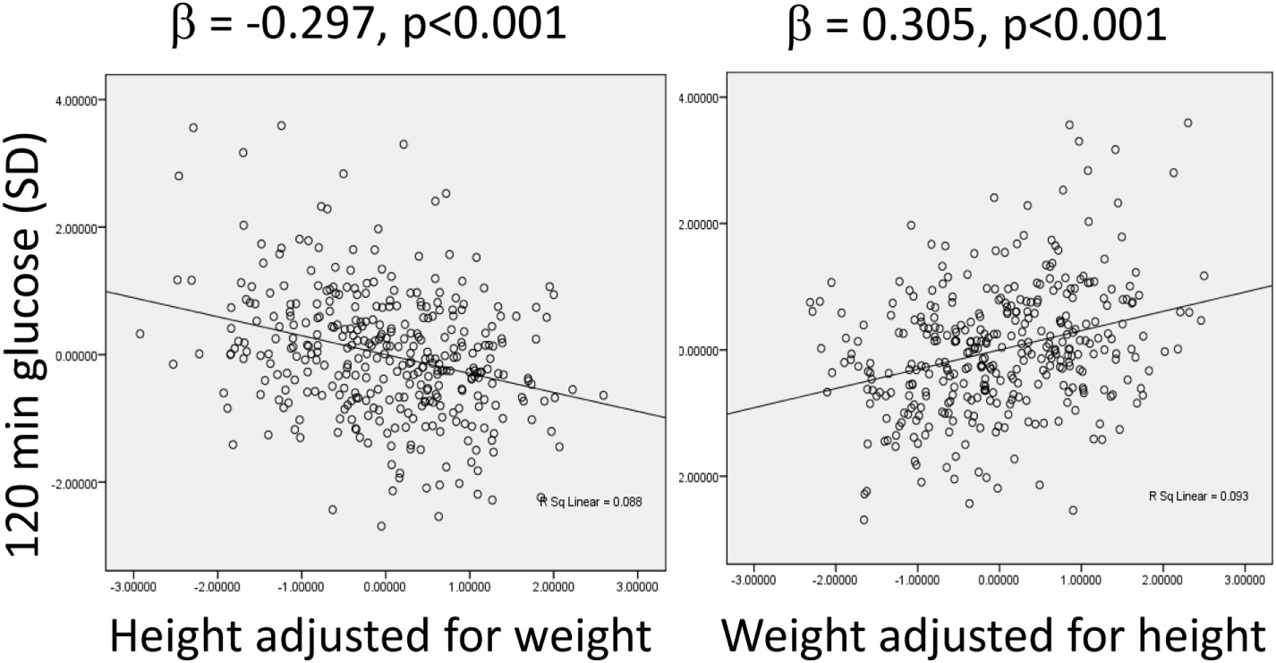Associations between plasma glucose levels 120 min after administration of an oral glucose load, a marker of glucose intolerance, with height adjusted for weight, and weight adjusted for height in an urban Indian population at the age of 21 years. Data taken from Ref. (67).