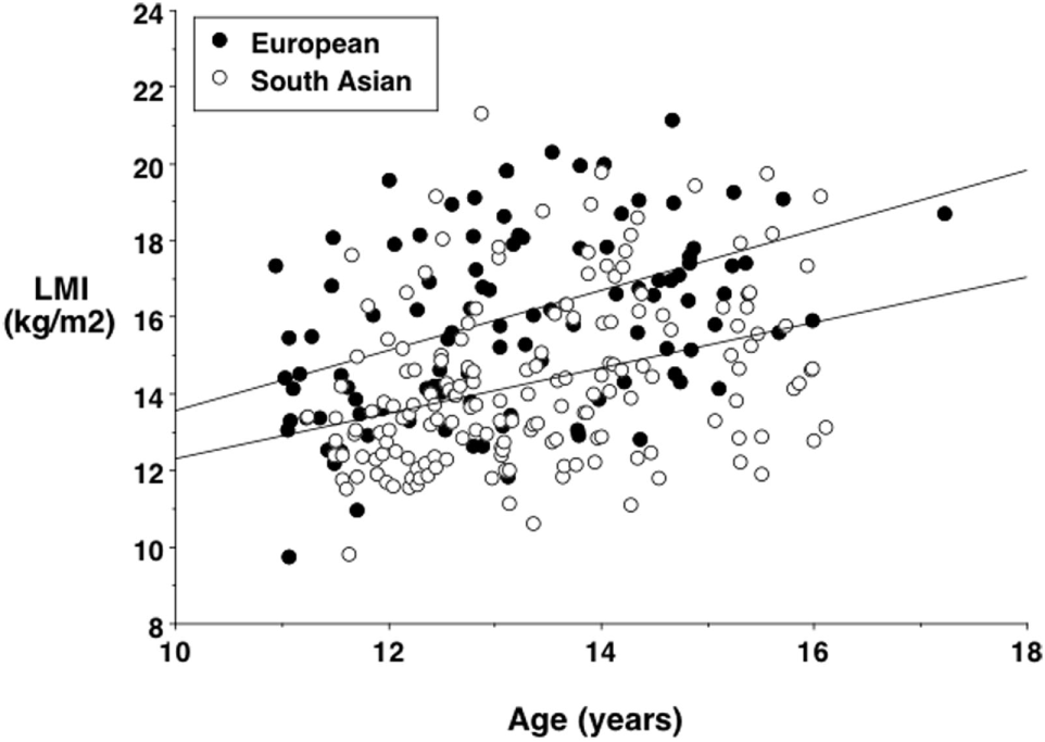 Lean mass index (lean mass divided by height squared) against age in European and South Asian adolescents living in London, UK, showing a systematic trend for lower values in the South Asians. Data taken from Ref. (96).