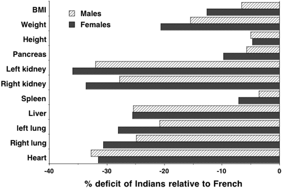 Data on height-adjusted organ masses from autopsies of Indian and French adults, expressed as % deficit of Indians relative to French. Data taken from Ref. (100, 101).