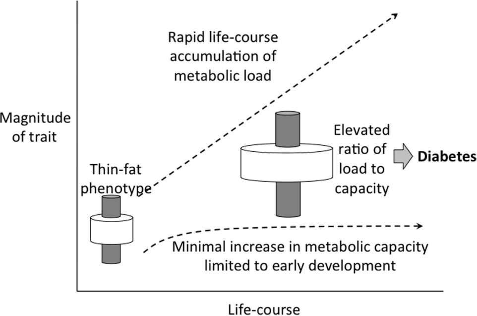 The capacity–load model offers a specific explanation for why reduced metabolic capacity has only led to an epidemic of diabetes and associated diseases in India in recent decades. If metabolic load remains relatively low, through the consumption of traditional diets and maintenance of high physical activity levels, then it will not outstrip metabolic capacity, and conditions such as diabetes should not manifest. This scenario is consistent with data from various populations characterized by relatively short stature, indicating low birth weight, which maintained traditional lifestyles through the twentieth century and demonstrated negligible rates of diabetes (89–91). It is the superimposition of high metabolic load associated with urbanization (sedentary behavior, diets high in fats and refined carbohydrates) on the background of low metabolic capacity that is predicted to lead to metabolic dysfunction (92).