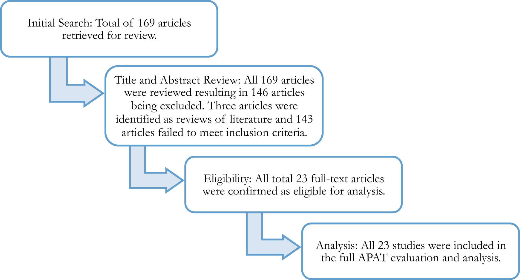 Research studies, identified through the initial search procedure, were then evaluated using a three-step process. First, reviewers conducted a title and abstract review on the potential studies identified in the initial search to confirm studies met inclusion criteria. Articles identified as reviews of literature were excluded but the reference lists from these articles were examined for additional potential articles. In the second step, articles meeting the inclusion criteria were then independently evaluated by one of the authors using the APAT. Finally, the second author independently evaluated each article to confirm agreement on the evaluation of the article as a Level I, II, or III.