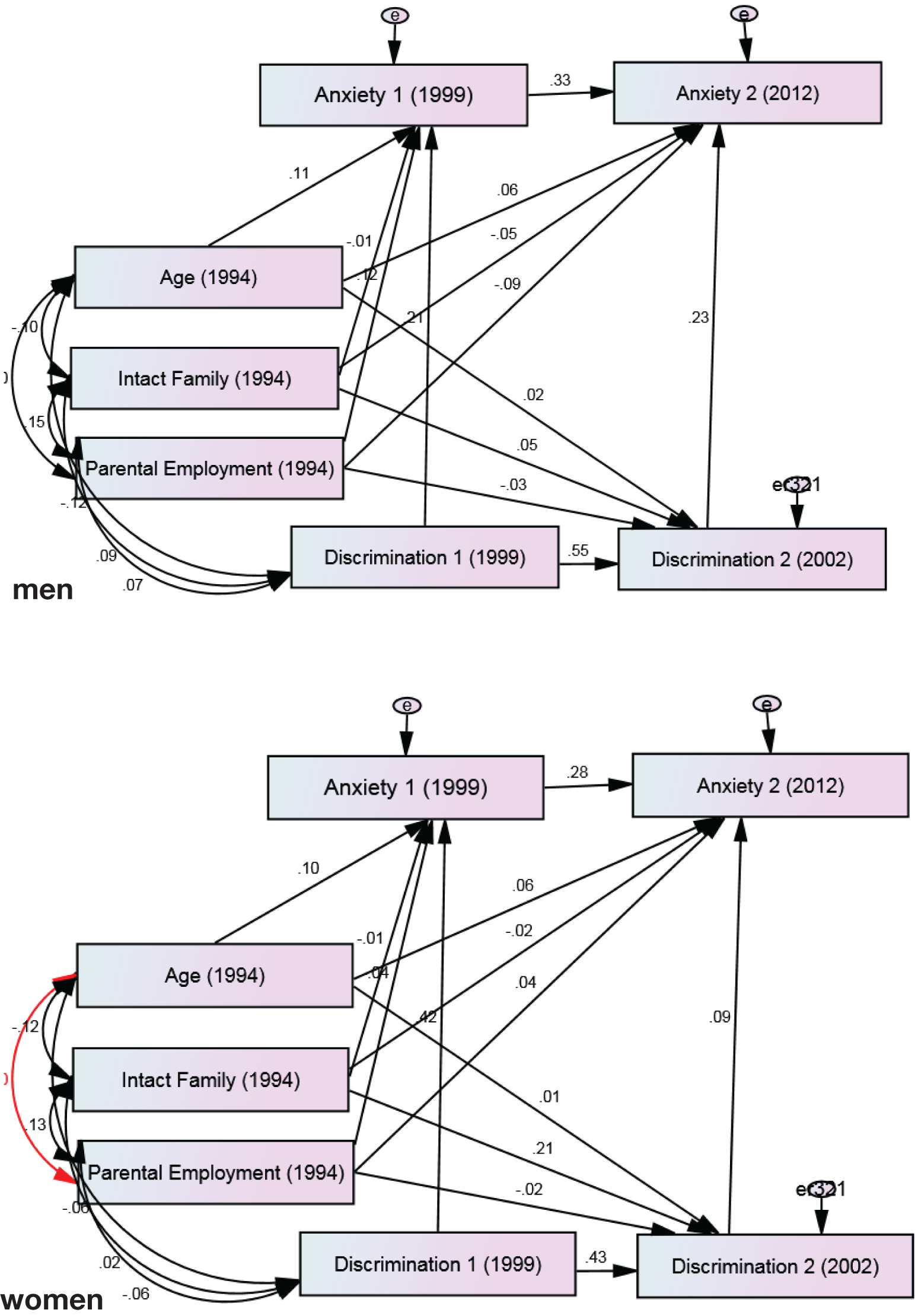 Summary of path analysis between changes in racial discrimination and changes in anxiety symptoms among male and female African-American youth.