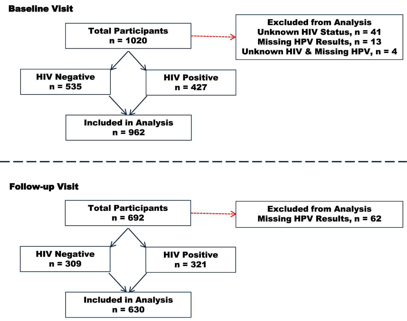 Of the 1,020 participants enrolled at baseline, we excluded 58 participants due to missing results (41 missing HIV results, 13 missing baseline HPV results, and 4 missing both HIV and baseline HPV results) leaving 962 women in the study. Some 72% (692/962) of these women completed follow-up visits. Of these, we excluded 62 participants whose HPV results were missing at follow-up leaving 630 women who had complete data for analysis for persistent HPV infections. The median time interval between the baseline and follow-up visits was 9 months. The participants’ flow through the study is depicted in Figure 1.