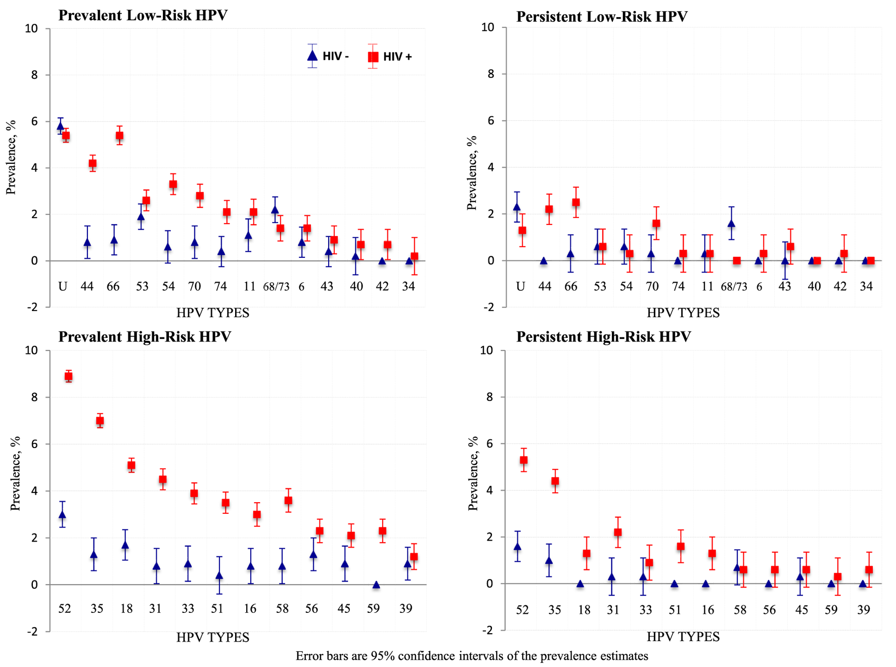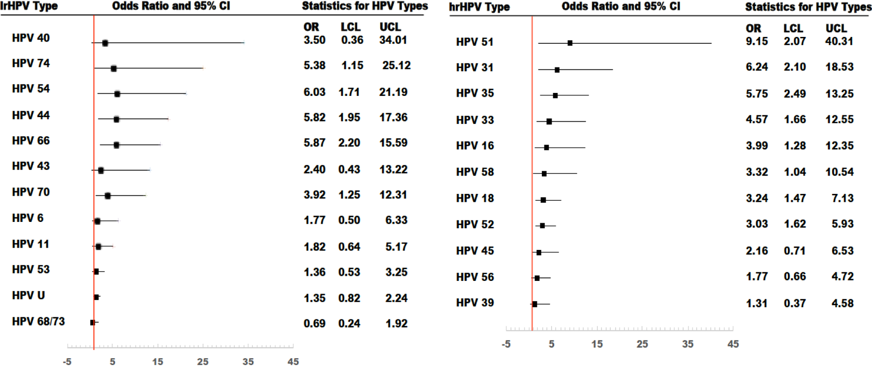 HIV infection was associated with higher prevalence of lrHPV, hrHPV, and persistence hrHPV infections, but not persistent lrHPV infections.