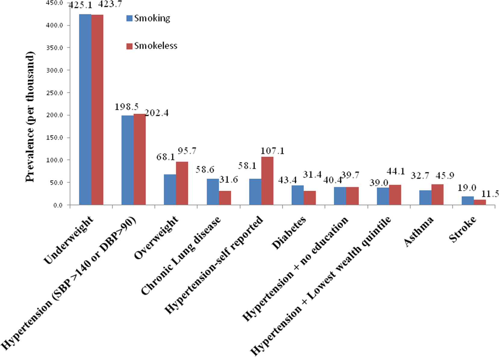 Prevalence of morbidities (per thousand) among smokers and smokeless tobacco users.