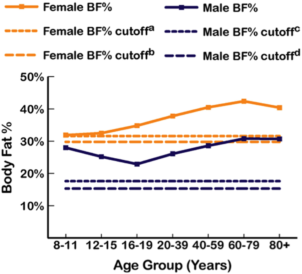 Mean percent body fat as dual-energy X-ray measurements from the 1999 to 2004 National Health and Nutrition Examination Survey (NHANES) by age group and sex (43), with body fat (BF) cutoffs from Lohman et al. (38) and Shea et al. (42). a31.6% BF (Lohman et al.). b29.8% BF (Shea et al.). c17.6% BF (Lohman et al.). d15.3% BF (Shea et al.).