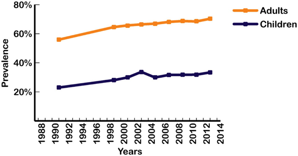 Prevalence of overweight and obesity in US adults and children from 1988 to 2014 (4, 5). Data points represent the middle year of each interval surveyed for adults and children. Intervals from left to right: 1988–1994; 1999–2000; 2001–2002; 2003–2004; 2005–2006; 2007–2008; 2009–2010; 2011–2012; 2013–2014. Based on crude estimates.