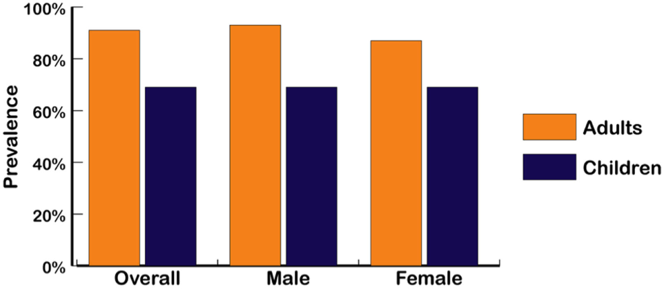 To estimate the prevalence of overfat adults and children in the US, we combined the populations of overweight, obese, and normal-weight individuals with increased health risks (MONW). In adults, recent crude data estimated overweight and obese prevalence in the US at 70.7% (5). Metabolically obese normal weight prevalence has been estimated between 5 and 45%, with variations due to ethnicity, sample size effects, differences in MONW definition, social and demographic factors, and others (66, 67). The relatively recent prevalence of MONW adult populations in North America and Europe that included both genders and a wide range of ages have been estimated by various authors to be between 24 and 36% (55, 68–72). However, we feel the meta-analysis by Wang et al., which showed the overall prevalence of MONW adults in the general population worldwide at 20% (95% CI 16.54–23.94), was an appropriate estimate for the US population, and was previously used for estimating overfat prevalence in developed countries (2). Wang et al. (54) included publications between 2006 and 2013 with a wide range of populations including Europeans (individual countries and mixed populations), North Americans (US and Canada), and Asians (including Chinese, Indian, and Korean). Combining the categories of overweight, obese, and MONW US adults brings the prevalence of overfat in the US to 90.7%.