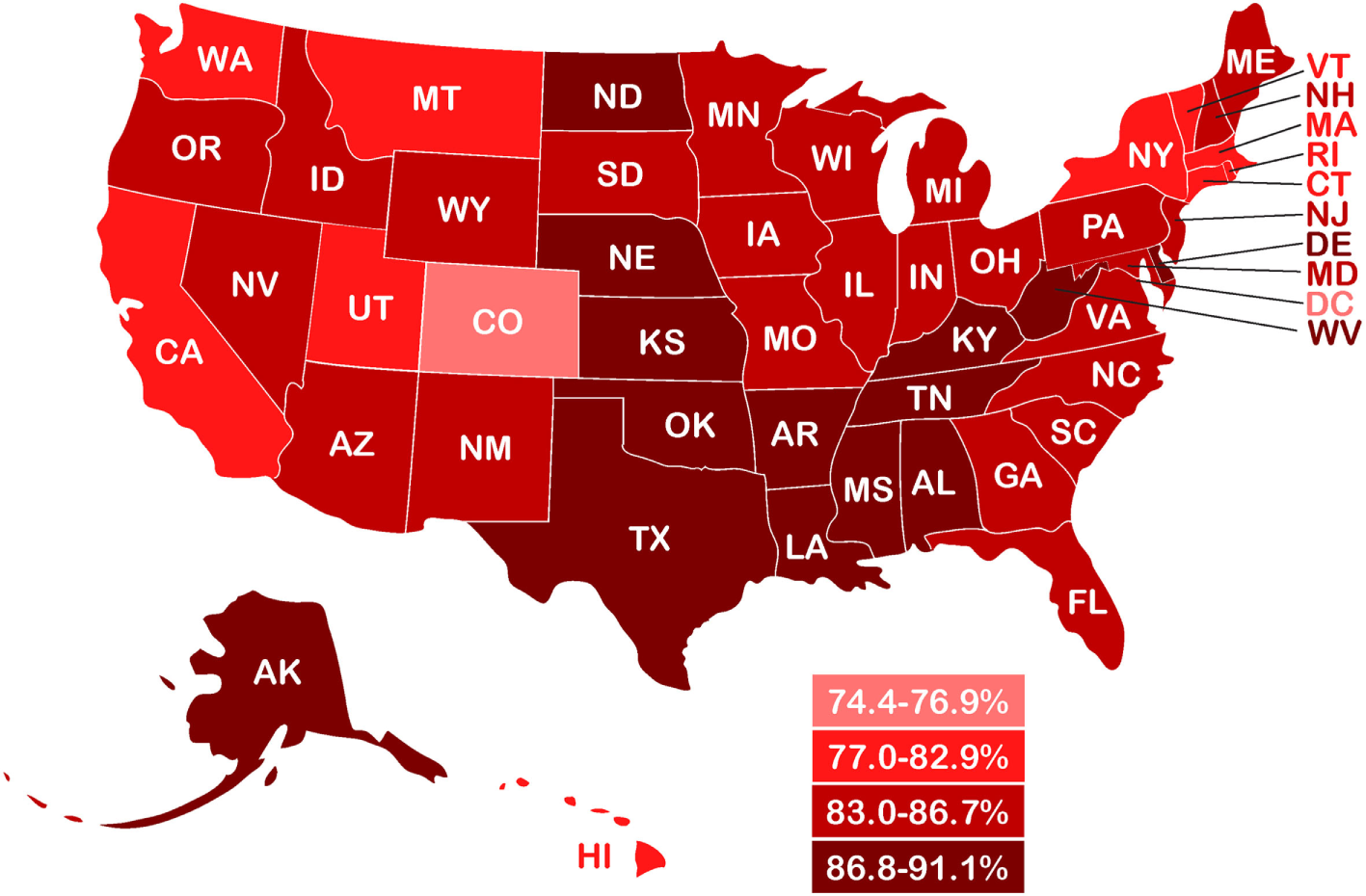 In children, as in adults, a wide range of normal weight high body fat conditions has been found in various populations. Mokha et al. (58) showed that in normal-weight non-obese children with a WHtR ≥ 0.5, over 55% had one to three cardiometabolic health risk factors associated with increases in WC, triglycerides, and blood pressure. In a Caucasian population of high school students, Olafsdottir et al. found 42% were normal-weight obese, defined as normal BMI with DXA body fat >17.6% in males and >31.6% in females, and with one or more risk factors for metabolic syndrome (39). Griffiths et al. (73) showed that 17.6% of normal-weight non-obese boys and 17.3% of normal-weight non-obese girls who exceeded a WHtR of 0.5 were considered “at risk,” as compared with children who were overweight or obese and above the 85th percentile, and Flegal et al. (45) estimated the prevalence of DXA-based adiposity in children with normal BMI below the 85th percentile and found that 35% within the 65th percentile cutoff and 24% within the 70th percentile cutoff had high adiposity. The WHtR-based study of Griffiths et al. (UK children) and the DXA-based data from Flegal et al. (US children) produced an average of 22% of overfat children (both genders), a figure also used in our recent estimates of children in developed countries (2). Combined with recent rates of US overweight and obese children aged 2–19 years of 46.9% (5), we estimated the overfat prevalence of US children to be 68.9%. Figure 3 shows the prevalence of overfat adults and children in the US, with State-by-State rates of overfat, which follow overweight and obese levels, shown in Figure 4.