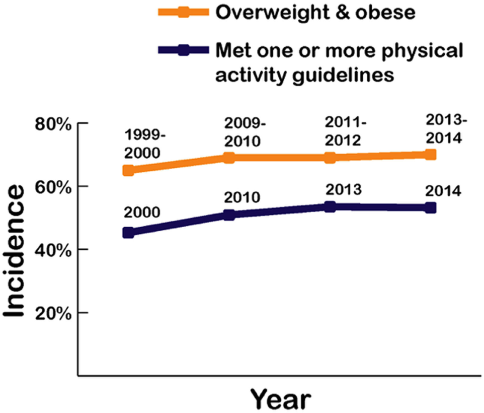 Recorded prevalence of being classified as overweight and obese alongside physical activity rates in US adults from 1999 to 2014 (4, 5).