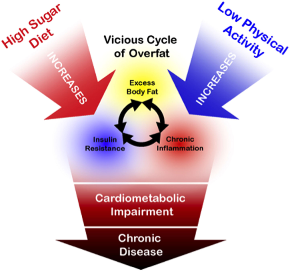 Schematic drawing illustrating general relationships between overfat and its downstream conditions, alongside the primary influence of a high sugar diet. While physical activity is of importance for a number of health-related factors, its influence on reducing the overfat occurrence is marginal by comparison with the lowering of sugar content in the diet (89–91, 94–106).
