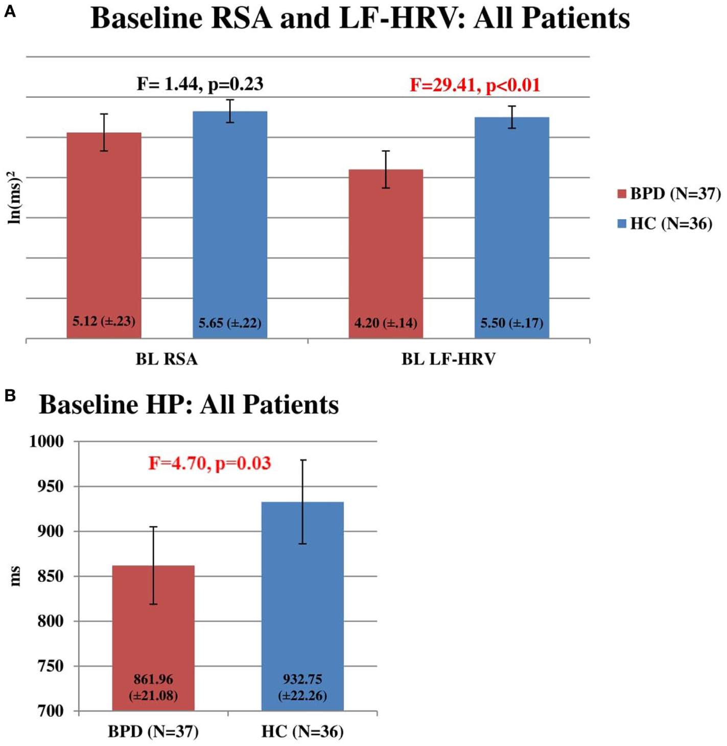 (A) Baseline respiratory sinus arrhythmia (RSA) and LF-heart rate variability (HRV) in all patients. Comparison of baseline RSA and LF-HRV in HC subjects (n = 36) and bipolar disorder (BD) patients (n = 37). No significant difference was found between RSA in HC subjects (5.65, SEM = 0.22) and BPD patients (5.12, SEM = 0.23) (F = 1.44, p = 0.23). Baseline LF-HRV was significantly higher in HC subjects (5.50, SEM = 0.17) than in BD patients (4.20, SEM = 0.14) (F = 29.41, p < 0.01). (B) Baseline heart period (HP) in all patients. Comparison of baseline HP in HC subjects (n = 36) and BD patients (n = 37). Baseline HP was significantly higher in HC subjects (932.75 ms, SEM = 22.26) than in BD patients (861.96 ms, SEM = 21.08) (F = 4.70, p = 0.03).