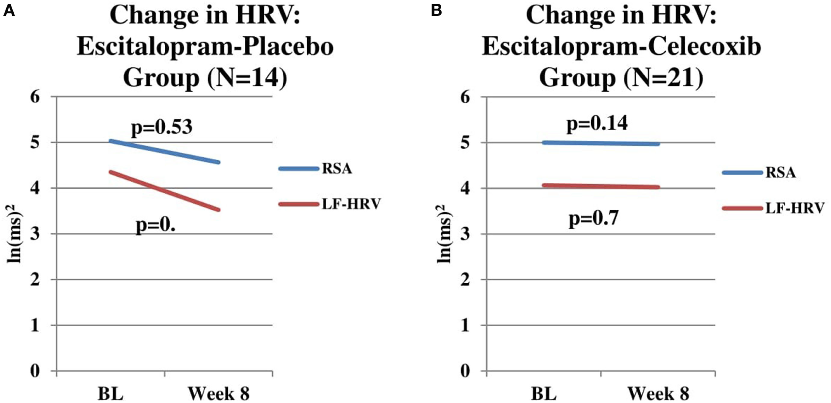 (A) Change in respiratory sinus arrhythmia (RSA) and LF-heart rate variability (HRV) in escitalopram-placebo group. Change in RSA and LF-HRV from baseline to end-of-study in patients receiving Escitalopram-placebo combination (n = 14). No significant changes in RSA (p = 0.54) or LF-HRV (p = 0.40) were found. (B) Change in RSA and LF-HRV in escitalopram–celecoxib group. Change RSA and LF-HRV from baseline to end-of-study in patients receiving escitalopram–celecoxib combination (n = 21). No significant changes in RSA (p = 0.14) or LF-HRV (p = 0.70) were found.