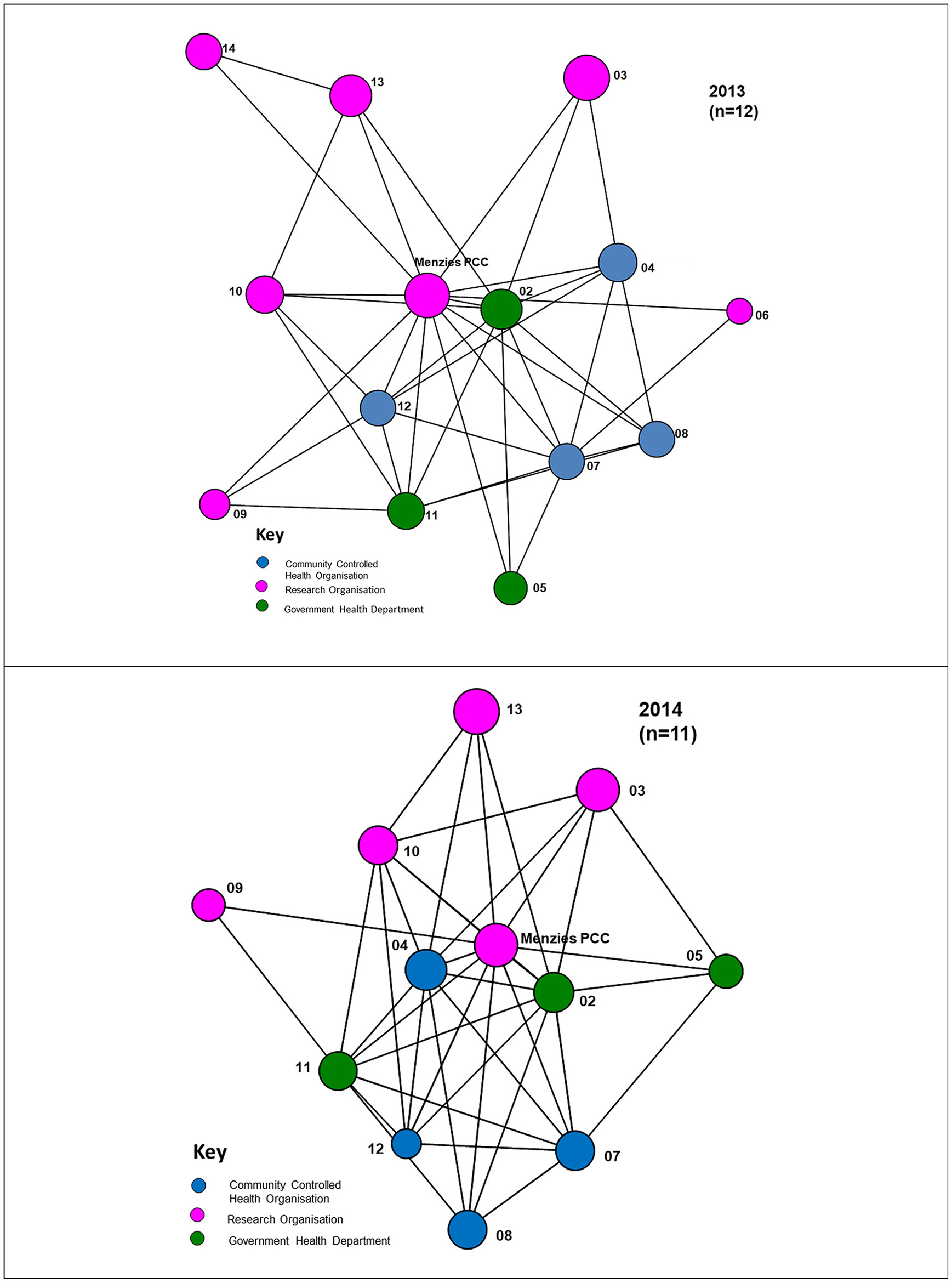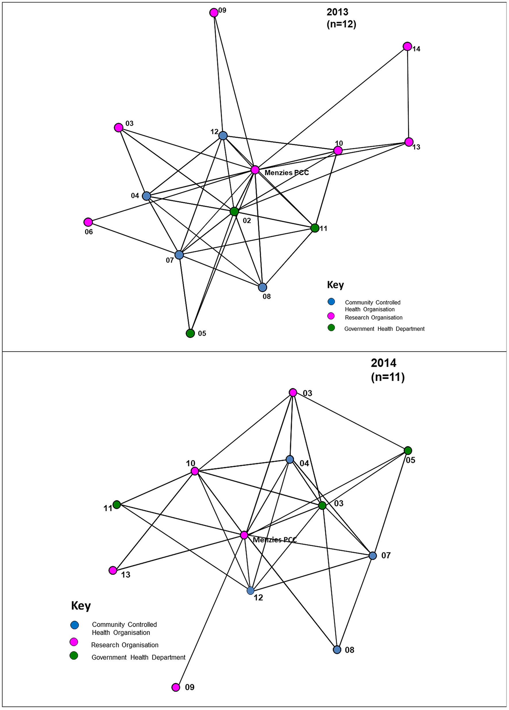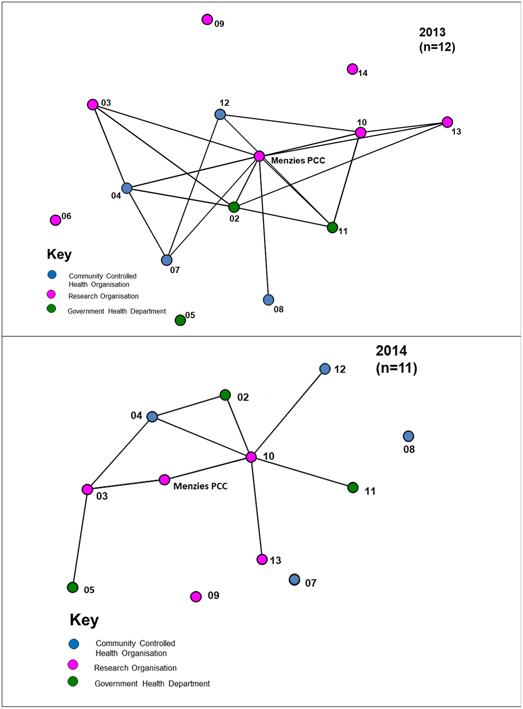 For the 2013 survey, 11 out of 14 Partnership organisations responded, including four ACCHOs, three state/territory government health departments and four research organisations. Two research organisations did not participate in the survey and another did not fully complete the survey. Therefore, figure descriptors provide the respondent numbers for the specific survey items. Non-respondents' linkage nodes are derived from responses of other respondents and are included in the figures to reflect the partner network. At the time of the 2014 survey, two partners were no longer active participants in the Partnership and 11 out of the 12 active Partnership organisations responded to the survey. This included four ACCHOs, three state/territory government health departments and four research organisations.