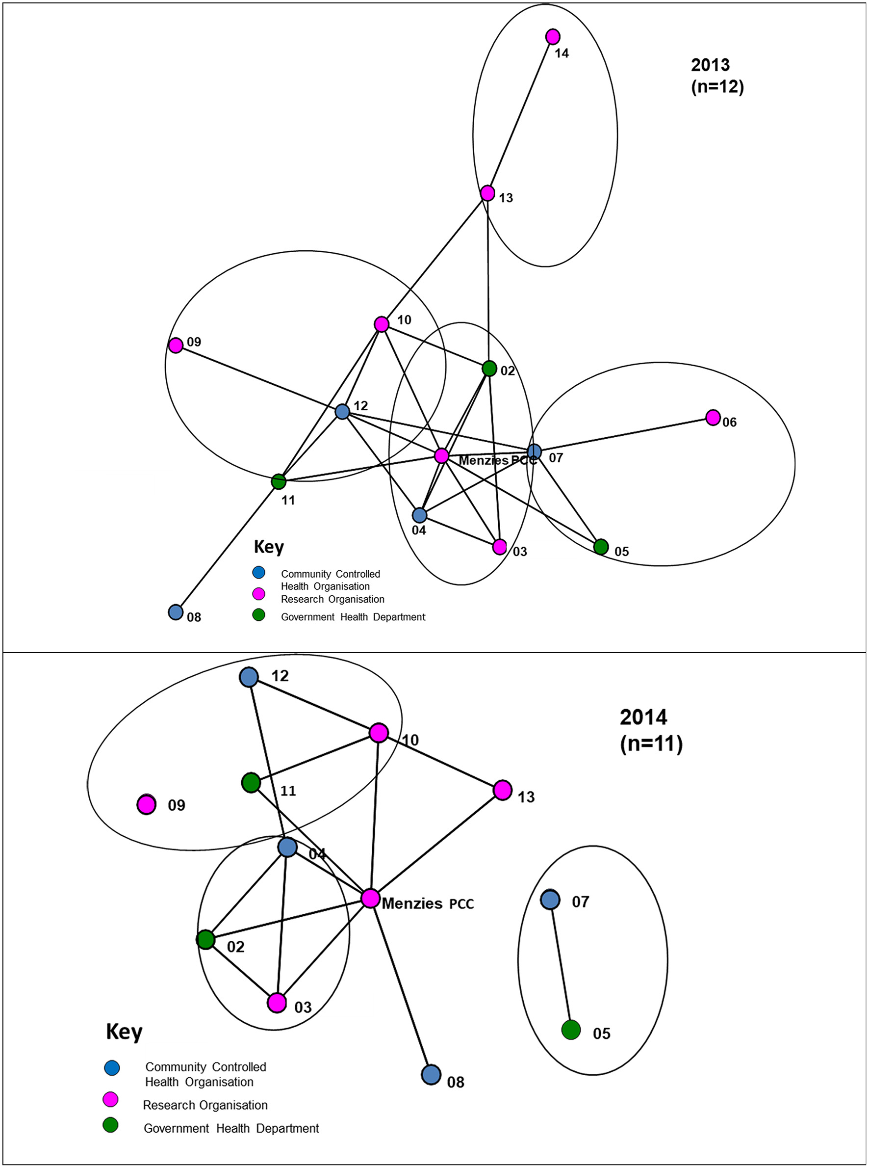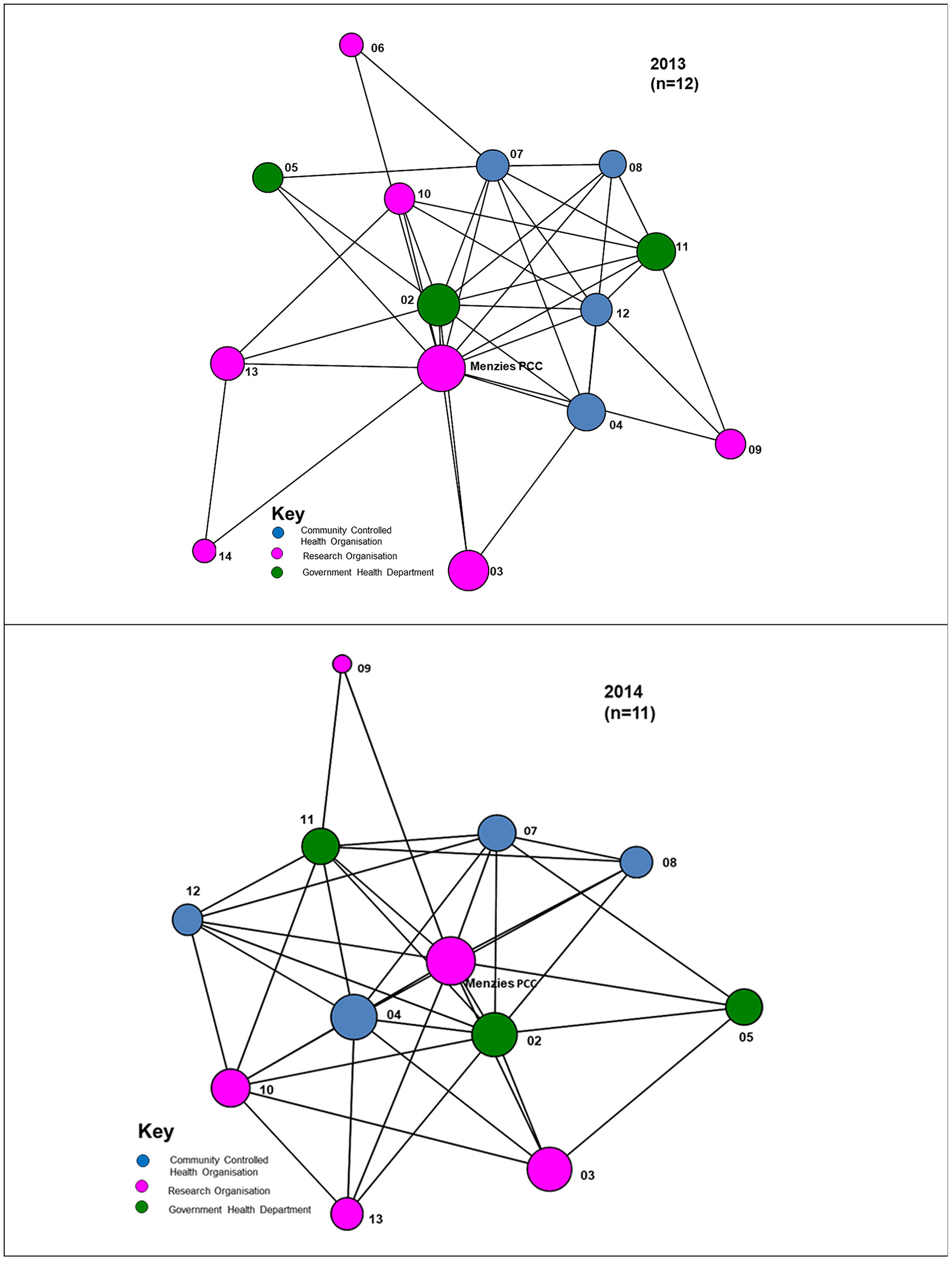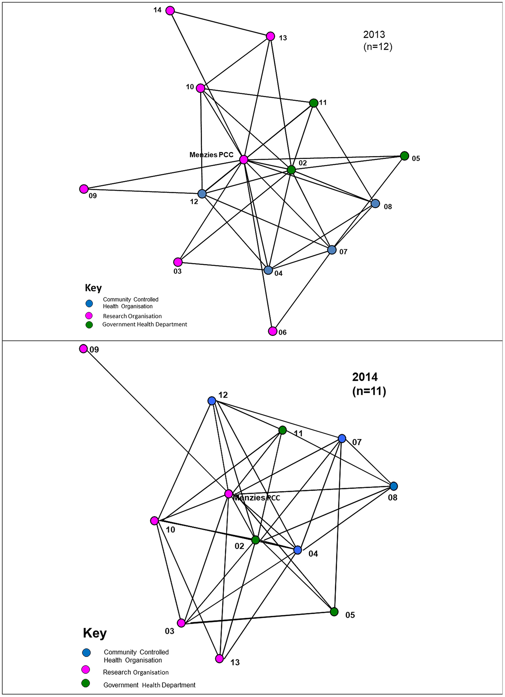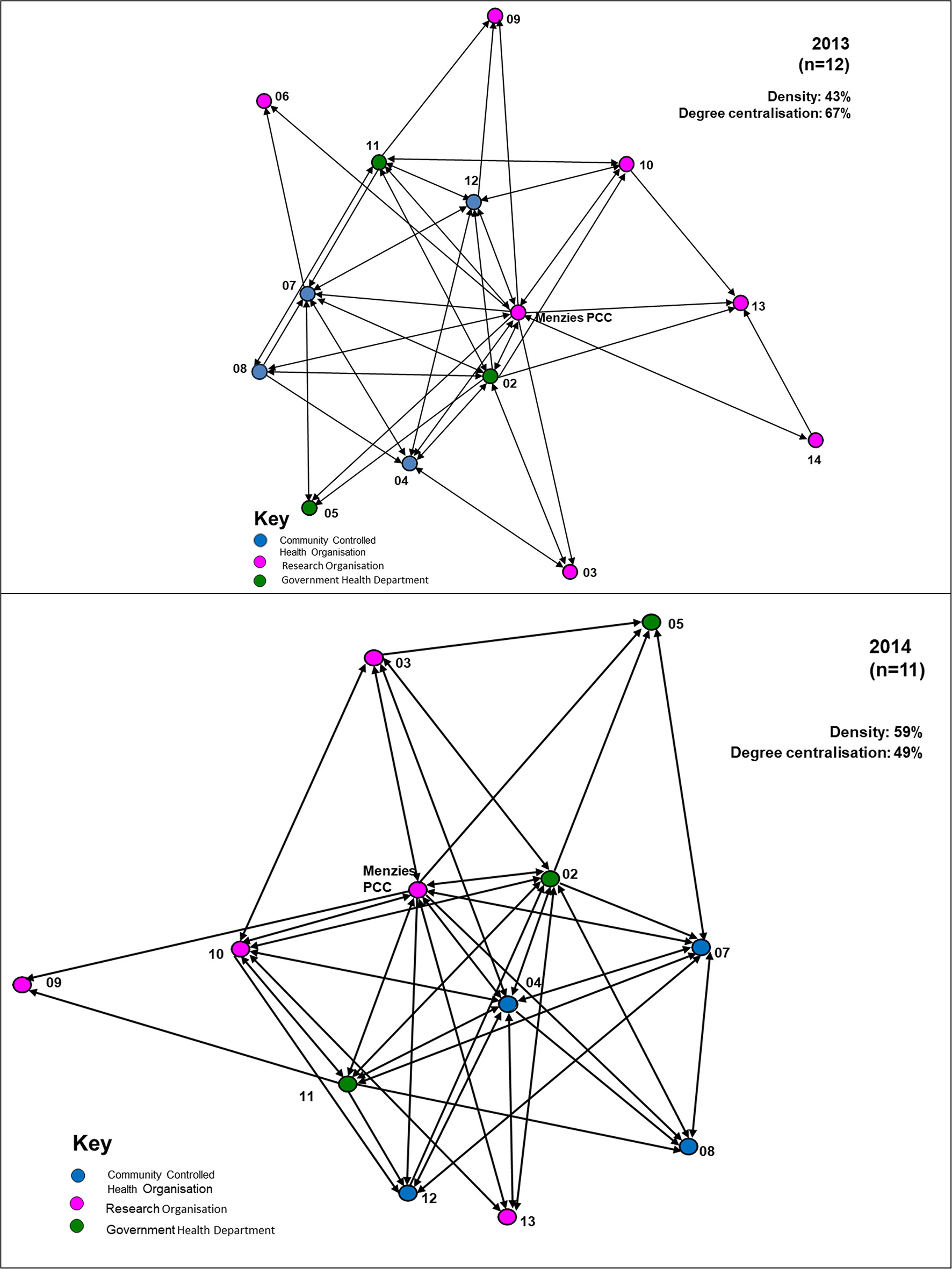 For the 2013 survey, 11 out of 14 Partnership organisations responded, including four ACCHOs, three state/territory government health departments and four research organisations. Two research organisations did not participate in the survey and another did not fully complete the survey. Therefore, figure descriptors provide the respondent numbers for the specific survey items. Non-respondents' linkage nodes are derived from responses of other respondents and are included in the figures to reflect the partner network. At the time of the 2014 survey, two partners were no longer active participants in the Partnership and 11 out of the 12 active Partnership organisations responded to the survey. This included four ACCHOs, three state/territory government health departments and four research organisations.