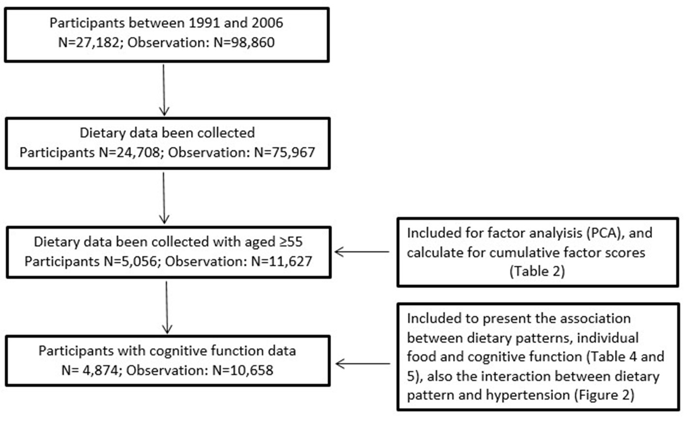 Therefore, the purpose of this present study was to evaluate the association between dietary pattern and cognitive function, and to provide the evidence for clinical intervention and public health dietary guidelines in preventing cognitive health among older people. The specific aims were (1) to examine the association between dietary pattern and cognitive function, and identify individual foods, which are associated with cognitive function; and (2) to test whether there is an interaction between dietary pattern and hypertension in relation to cognitive function.