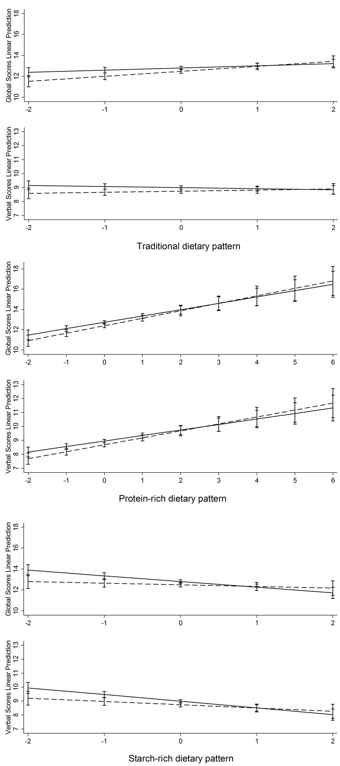 Results: Three dietary patterns were identified by factor analysis, named “Traditional Chinese,” “Protein-rich,” and “Starch-rich” dietary pattern. A Protein-rich dietary pattern (high intake of milk, eggs and soymilk) was significantly associated with higher cognitive global scores and verbal memory scores, while the starch-rich dietary pattern (high intake of salted vegetable and legumes) was significantly associated with lower cognitive global and verbal memory scores. In addition, we found that participants with hypertension were independently associated with significant low cognitive function.