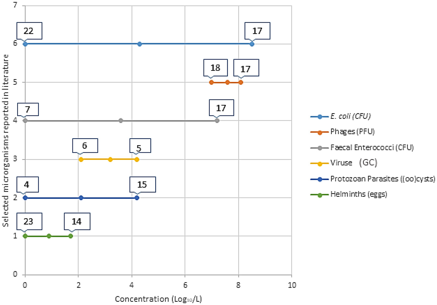 Visual representation of minimum and maximum concentration (Log10/L) of selected microorganisms in partially treated and untreated wastewater intended for reuse. The numbers on the bars represents the individual references with these reported concentrations. These articles are referenced in Table 1, where further information is provided. This is a brief introduction of the different concentrations reported in literature for the different categories of microorganisms. Table 1 gives detailed information on the literature added in this figure.