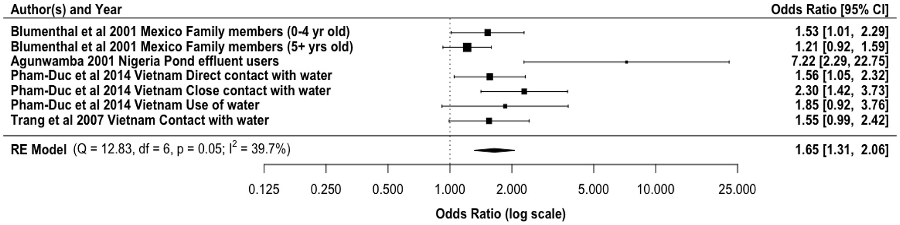 The use of partially treated and untreated wastewater for irrigation is beneficial in agriculture but may be associated with human health risks. Reports from different locations globally have linked microbial outbreaks with agricultural reuse of wastewater. This article reviews the epidemiological evidence and health risks associated with this practice, aiming toward evidence-based conclusions. Exposure pathways that were addressed in this review included those relevant to agricultural workers and their families, consumers of crops, and residents close to areas irrigated with wastewater (partially treated or untreated). A meta-analysis gave an overall odds ratio of 1.65 (95% CI: 1.31, 2.06) for diarrheal disease and 5.49 (95% CI: 2.49, 12.10) for helminth infections for exposed agricultural workers and family members. The risks were higher among children and immunocompromised individuals than in immunocompetent adults. Predominantly skin and intestinal infections were prevalent among individuals infected mainly via occupational exposure and ingestion. Food-borne outbreaks as a result of crops (fruits and vegetables) irrigated with partially or untreated wastewater have been widely reported. Contamination of crops with enteric viruses, fecal coliforms, and bacterial pathogens, parasites including soil-transmitted helminthes (STHs), as well as occurrence of antibiotic residues and antibiotic resistance genes (ARGs) have also been evidenced. The antibiotic residues and ARGs may get internalized in crops along with pathogens and may select for antibiotic resistance, exert ecotoxicity, and lead to bioaccumulation in aquatic organisms with high risk quotient (RQ). Appropriate mitigation lies in adhering to existing guidelines such as the World Health Organization wastewater reuse guidelines and to Sanitation Safety Plans (SSPs). Additionally, improvement in hygiene practices will also provide measures against adverse health impacts.
