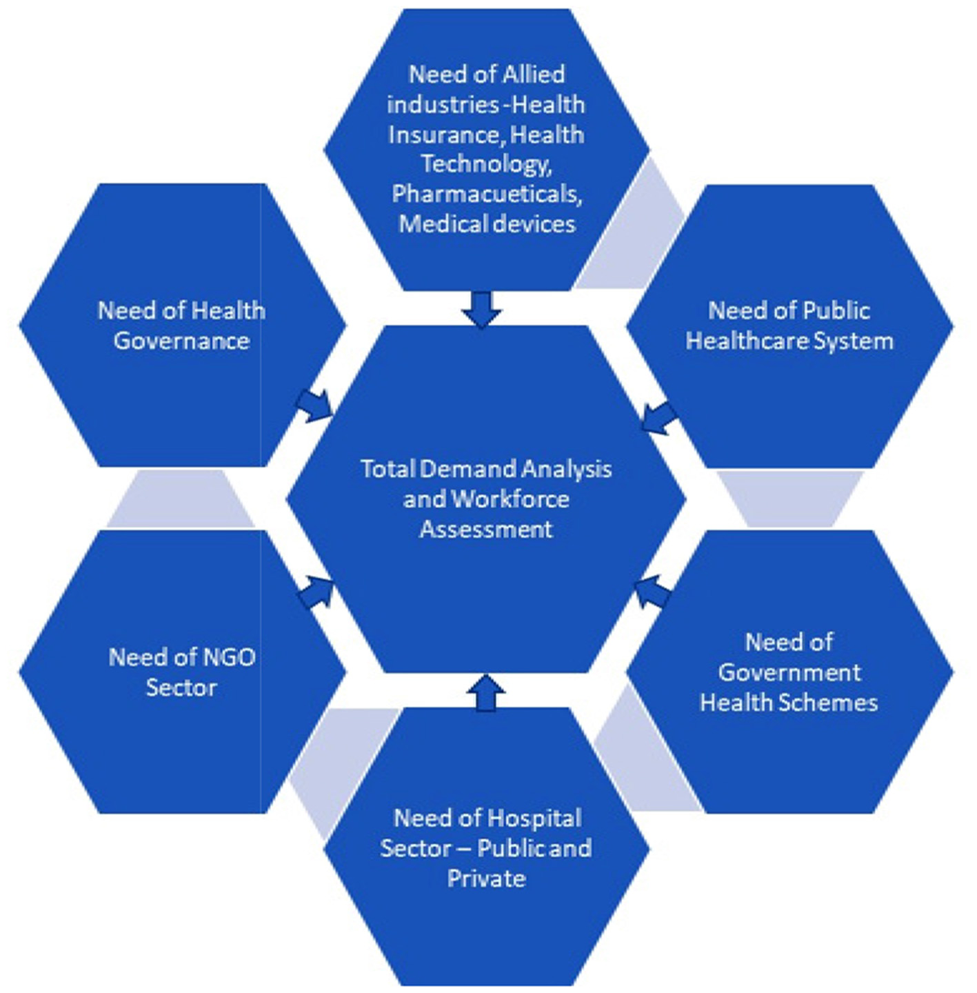 Currently, no valid assessment is available of the number and types of healthcare professionals required to serve the industry. This is critical information, as it forms the basis for estimating the capacities required for the future; both in terms of quantity and the type of professionals required. As depicted in Figure 1, a demand analysis could be made based on a detailed work force assessment that takes into consideration the requirements of the following: the state and district level agencies in the public healthcare system, various governmental health schemes, requirements of private/public hospital sector/non-governmental organizations sector, allied areas of healthcare management, such as health insurance, health technology, governance, and pharmaceuticals.