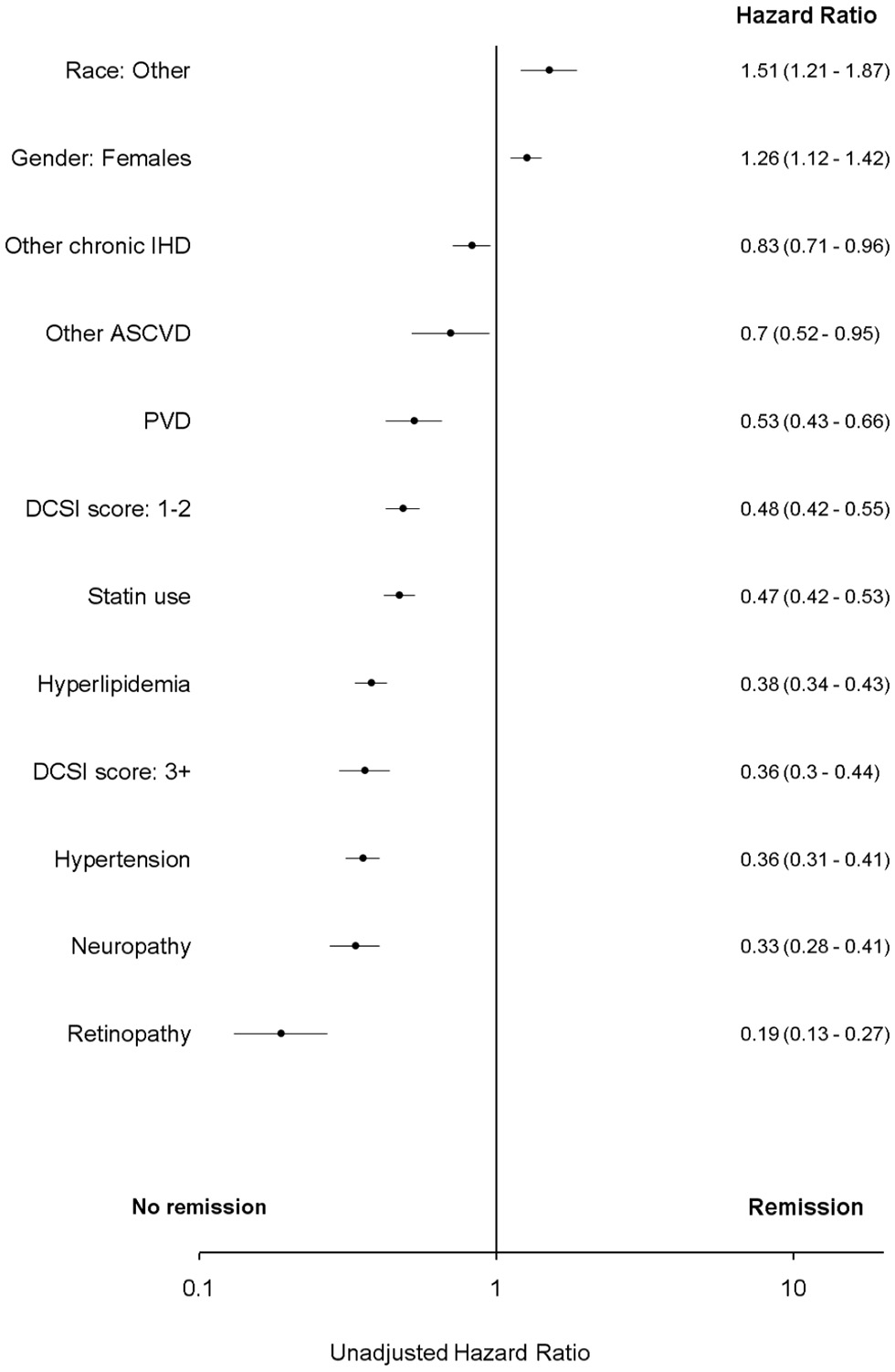 Results: 4.97% of patients studied met the definition of T2DM “remission” in the study cohort. After adjusting for covariates this study found a number of variables associated with T2DM “remission” that were not previously reported: no statin use; low diabetes complications severity index score; no hypertension; no neuropathy; no retinopathy; race (non-white and non-African American); presence of other chronic ischemic heart disease (IHD) and females (p < 0.05).