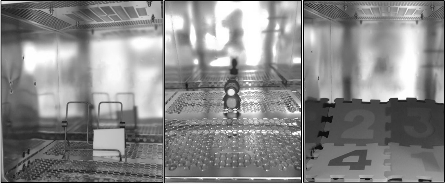 In experiments of this kind, the test sample is placed in an emission chamber which consists of a material with low adsorption and desorption characteristics. The environmental parameters in the chamber are regulated to mimic an indoor environment. A 203 l VOC emission test chamber model VCE 200 from Vötsch Industrietechnik (Balingen-Frommern, Germany) was used for emission testing. It had an inner chamber made of electro-polished stainless steel and a ventilator to ensure homogeneous air distribution. The standard plate pieces were placed on an easel while the toy samples were placed on the metal grid positioned at the bottom of the chamber (see Figure 1). Four samples with high emissions were pre-selected: The whole figurine for sample #2 and #3, one water wing for sample #1 and four puzzle pieces for sample #4 were loaded in the chamber. The parameters were set up in line with ISO 16000-9 (17) to a temperature of 23 ± 2°C, 50 ± 5% relative humidity and an air change rate of 0.5/h.